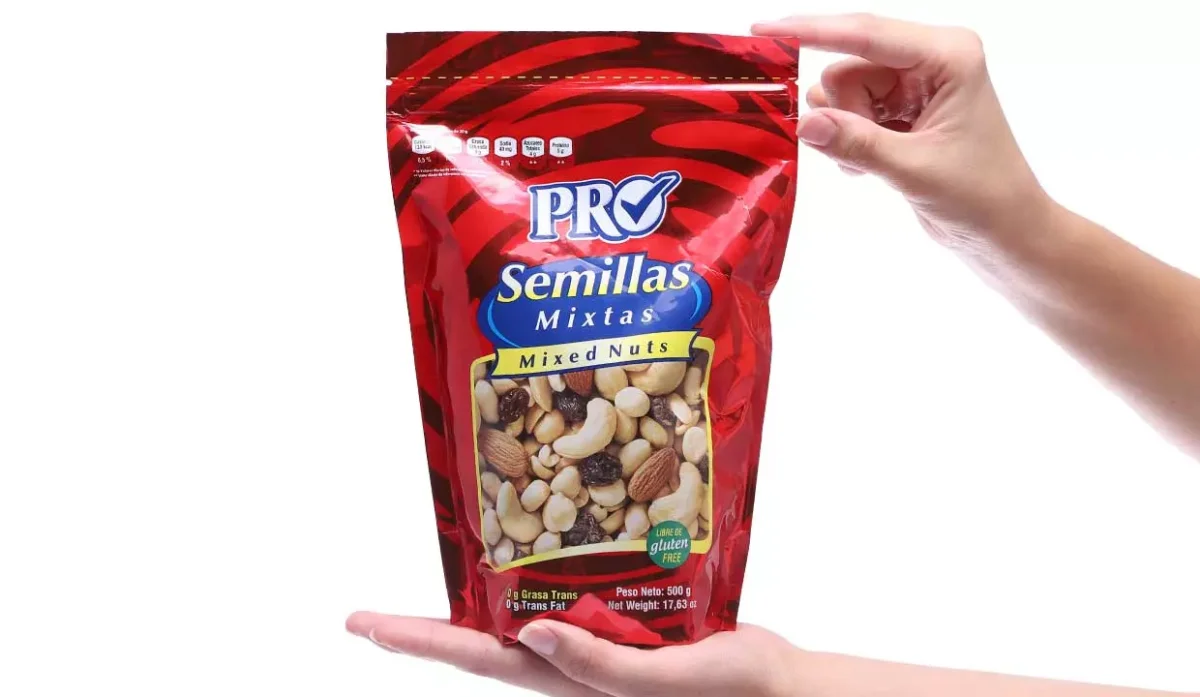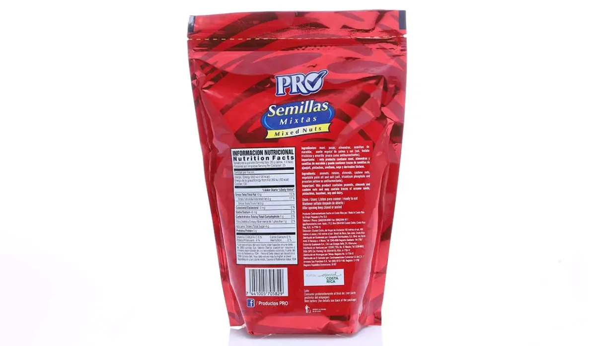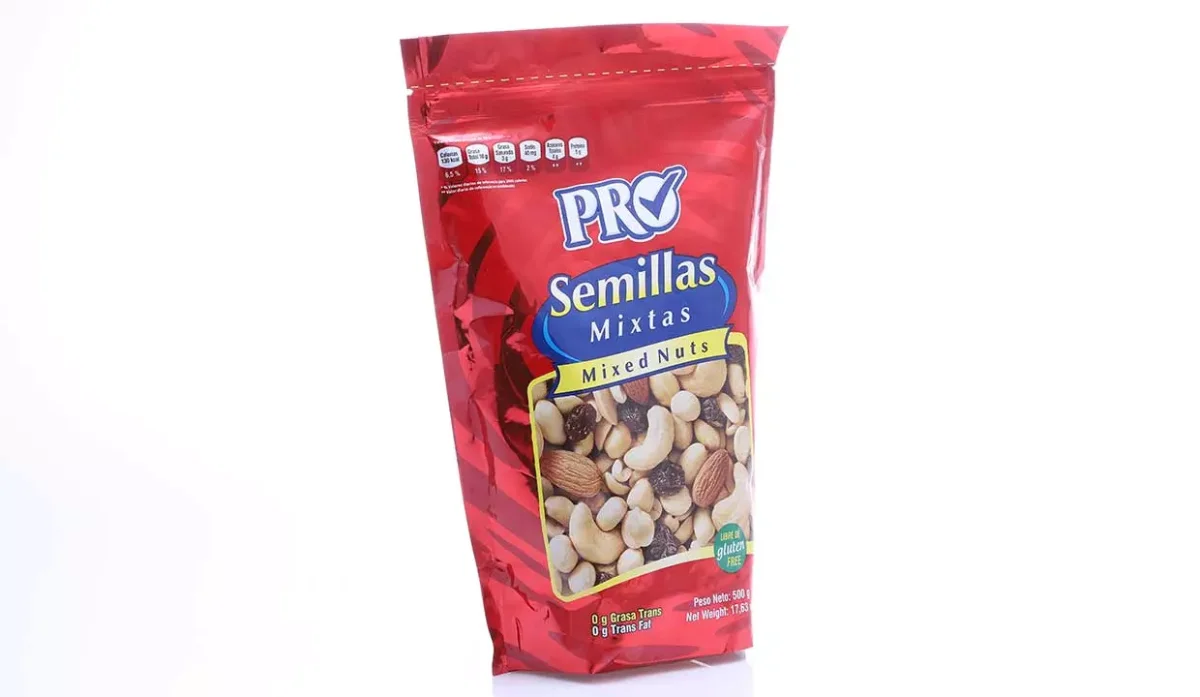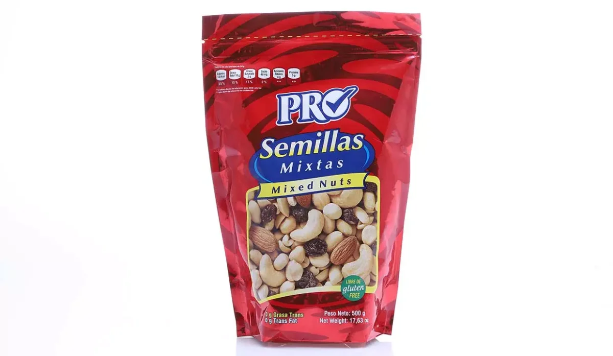 - Semillas mixtas: maní, pasas, almendras, semillas de marañón, aceite vegetal de palma y sal.