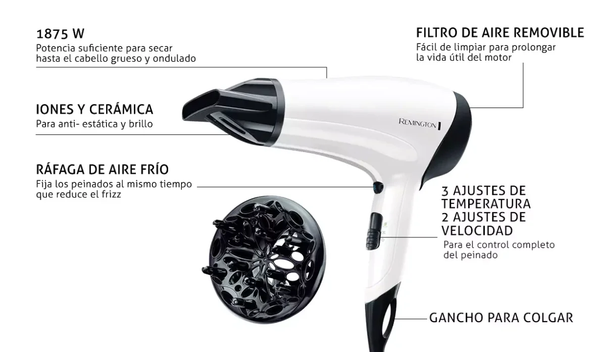| Potente secador de 1875W para secar el cabello más grueso y ondulado | |