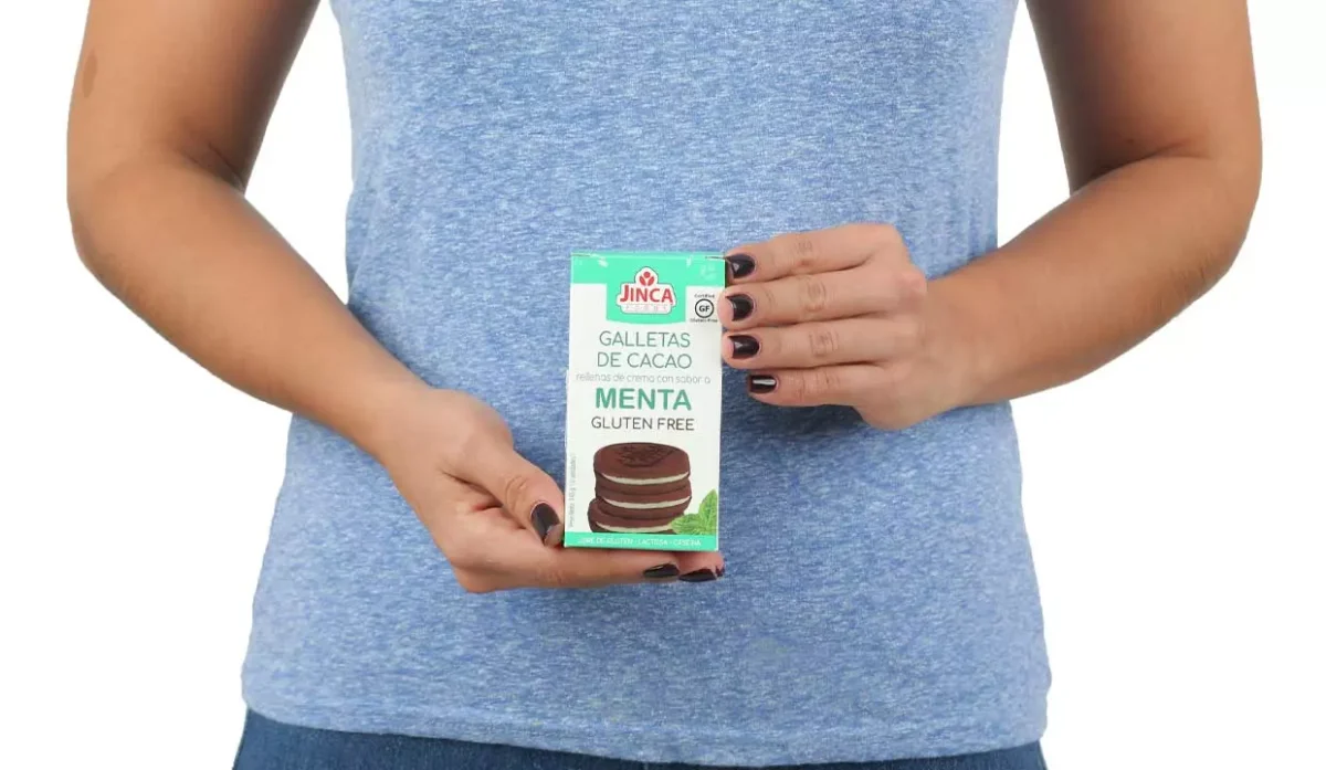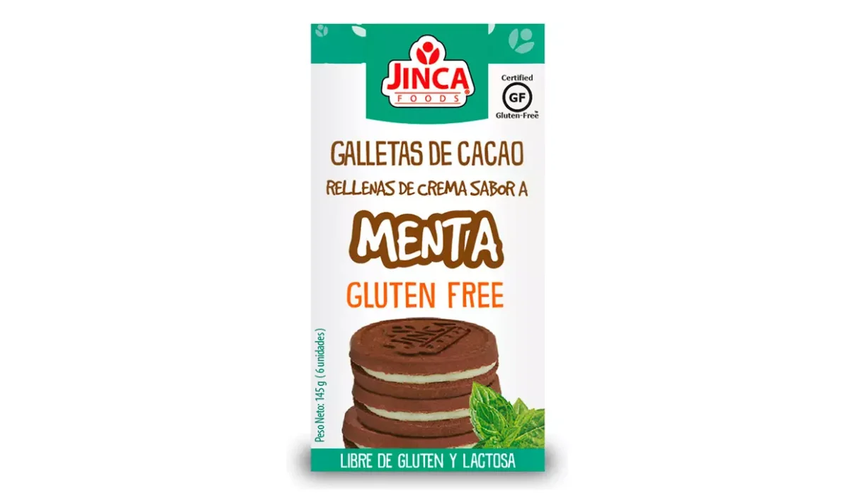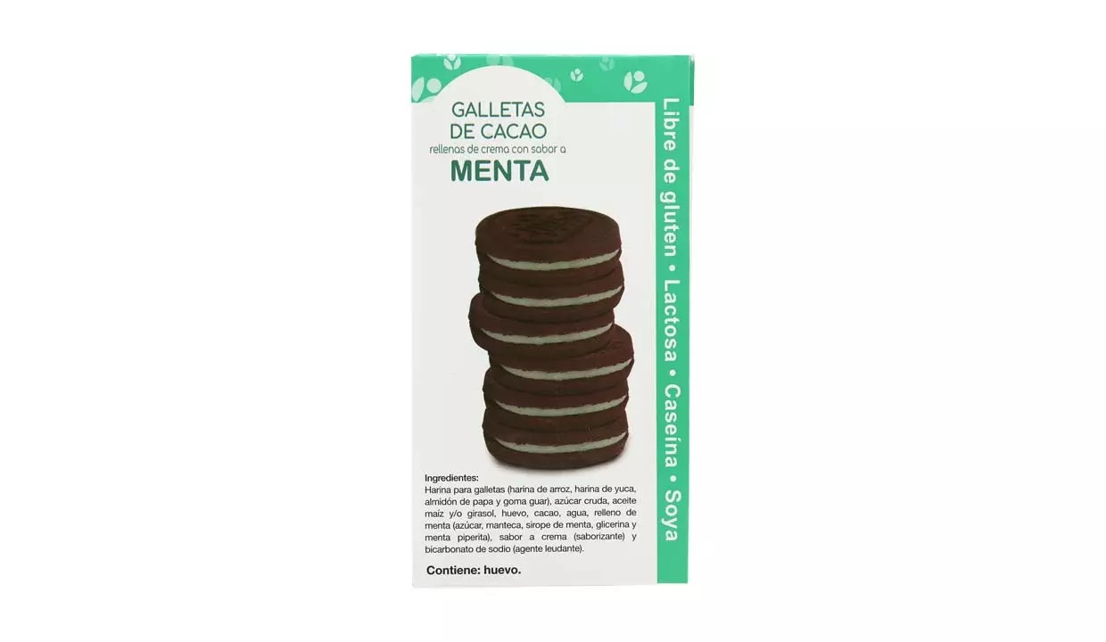 - Harina de arroz, harina de yuca, almidón de papa, azúcar cruda, bicarbonato de sodio, aceite de maíz y/o girasol, huevo, cacao, agua, relleno de menta y sabor a crema.