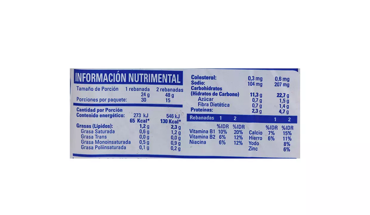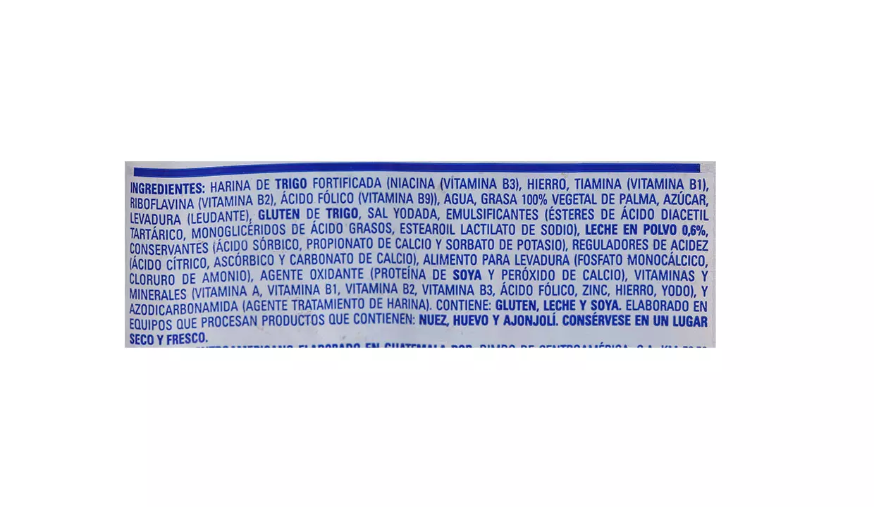 - Harina de trigo, agua, azúcar, levadura, gluten, leche y soya.