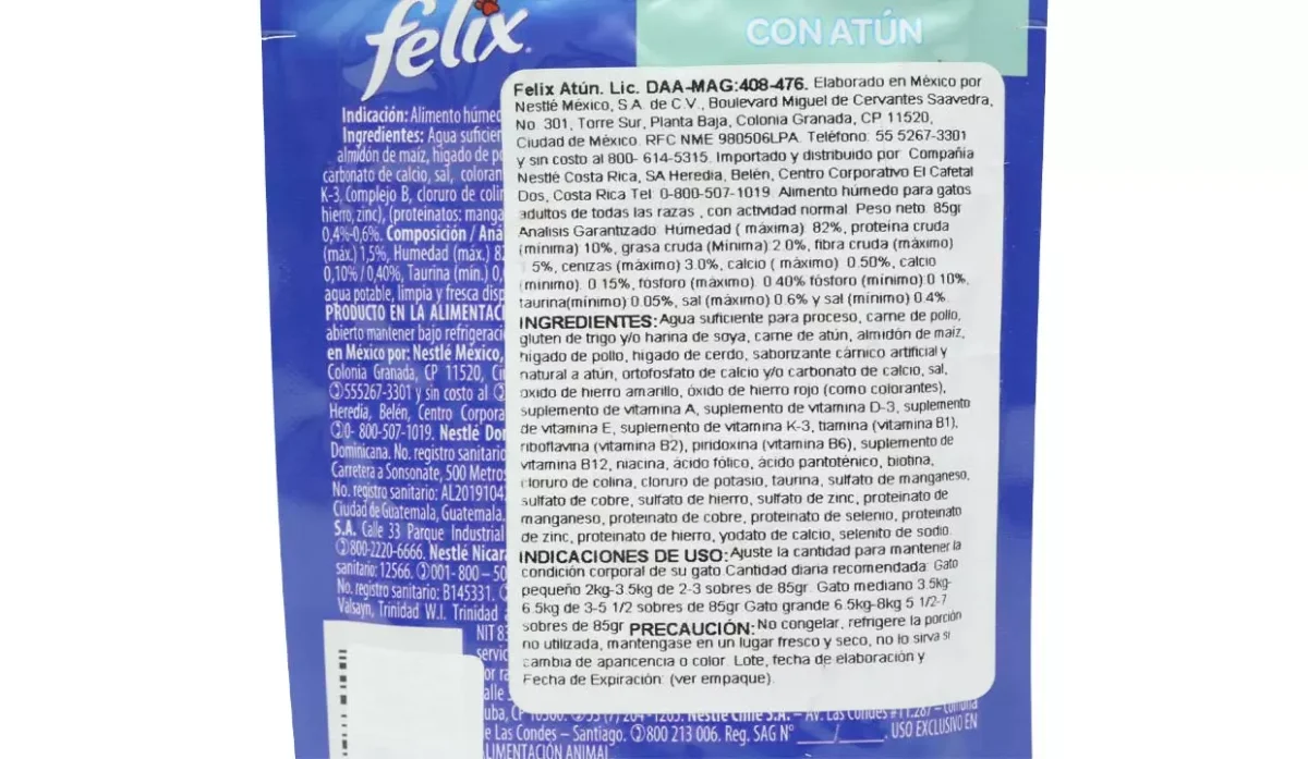 - Carne de pollo, hígado de cerdo, gluten de trigo, carne de atún, víceras de cerdo y soya.
