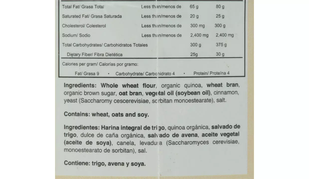 - Harina integral, quinoa orgánica, dulce de caña, avena, canela, levadura y sal.