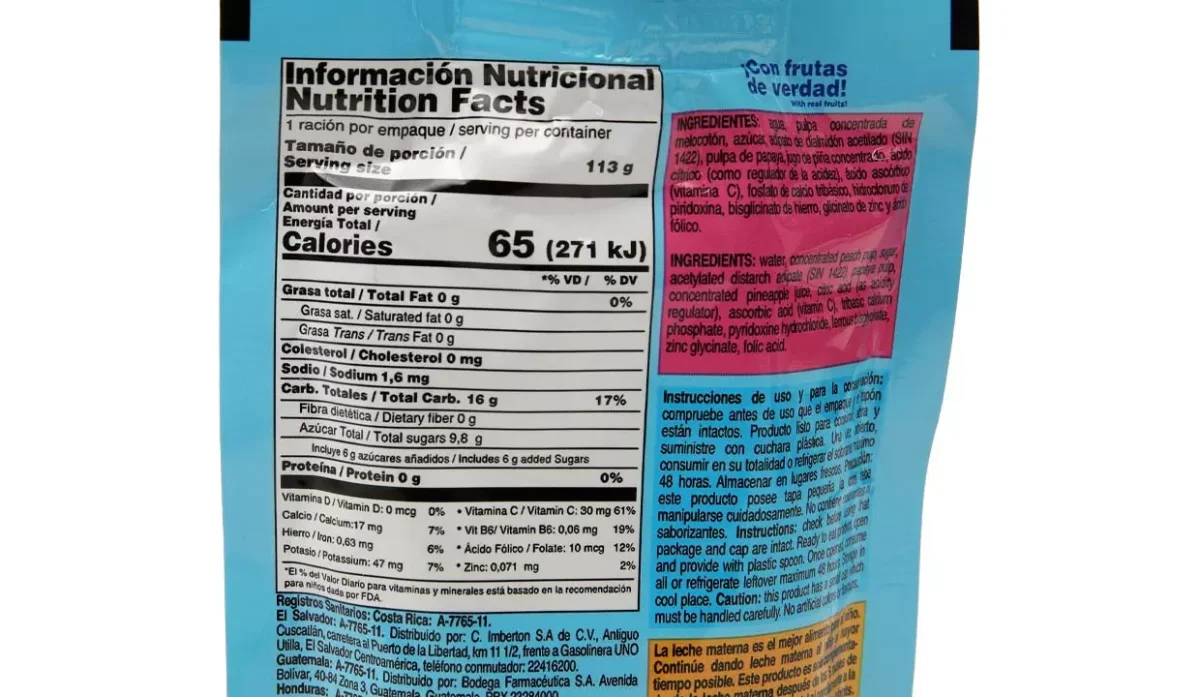 - Agua, azúcar, pulpa concentrada de melocotón, piña y papaya.