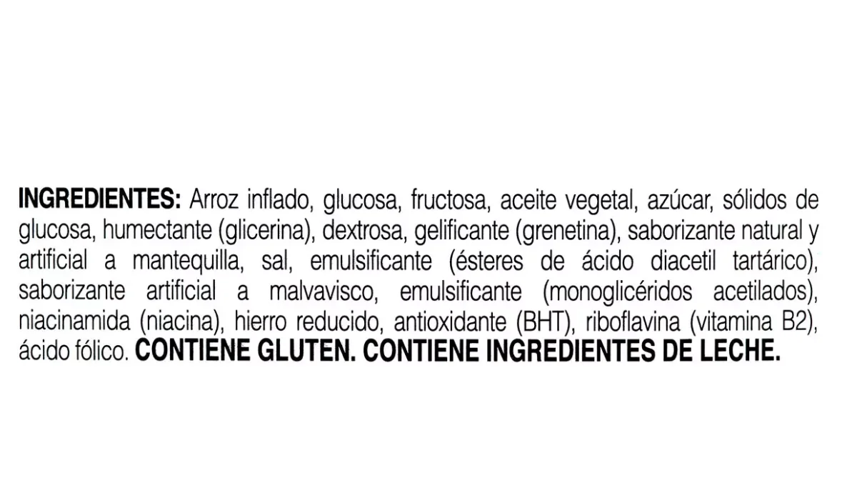 - Arroz inflado, glucosa, fructosa, sal, saborizante natural y artificial sabor a malvavisco.