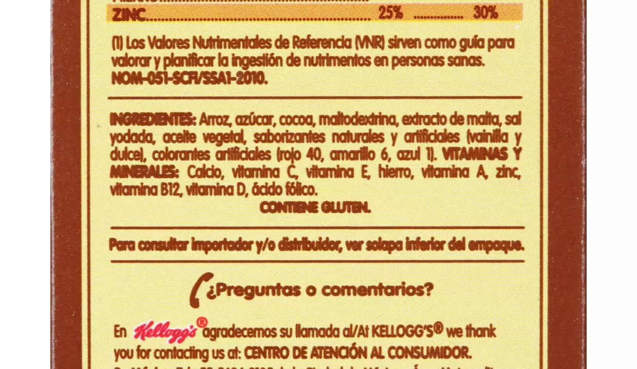 - Arroz, azúcar, cocoa, sal yodada, extracto de malta, aceite de vegetal y saborizantes naturales.