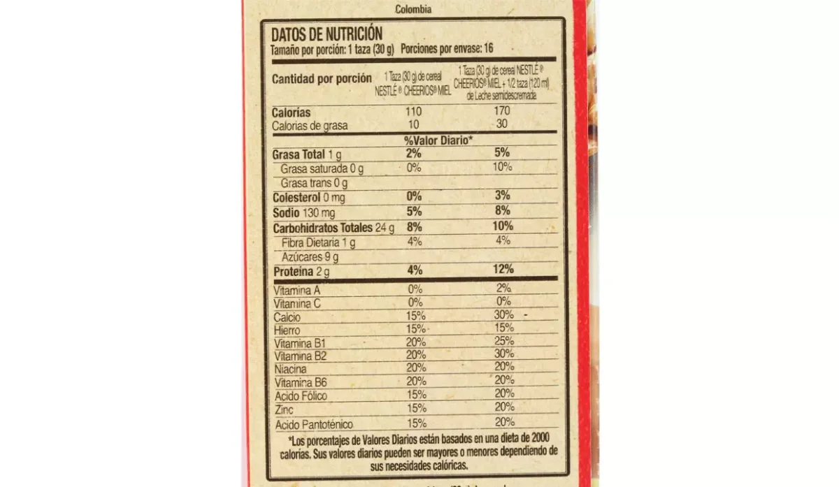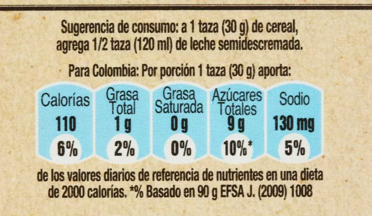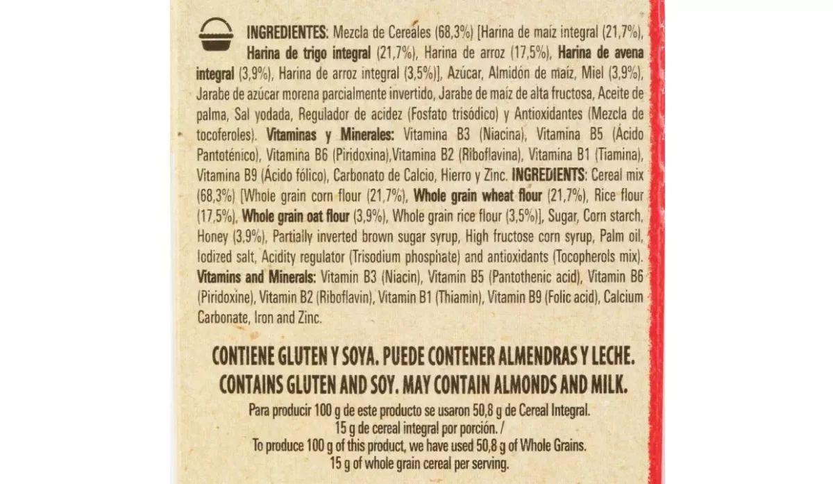 - Mezcla de cereales, harina de trigo integral, harina de arroz, harina de avena integral, azúcar, almidón de maíz, miel, azúcar morena y sal yodada.