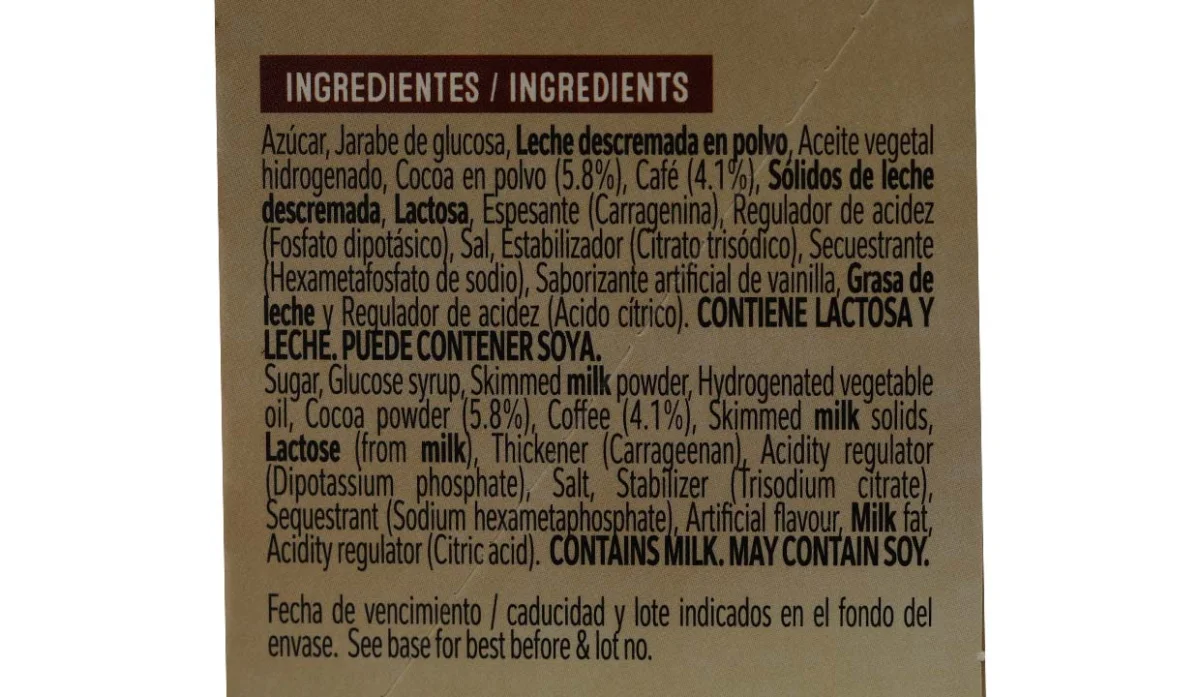 - Azúcar, leche descremada en polvo, aceite de coco, cocoa y lactosa.