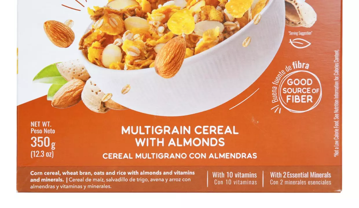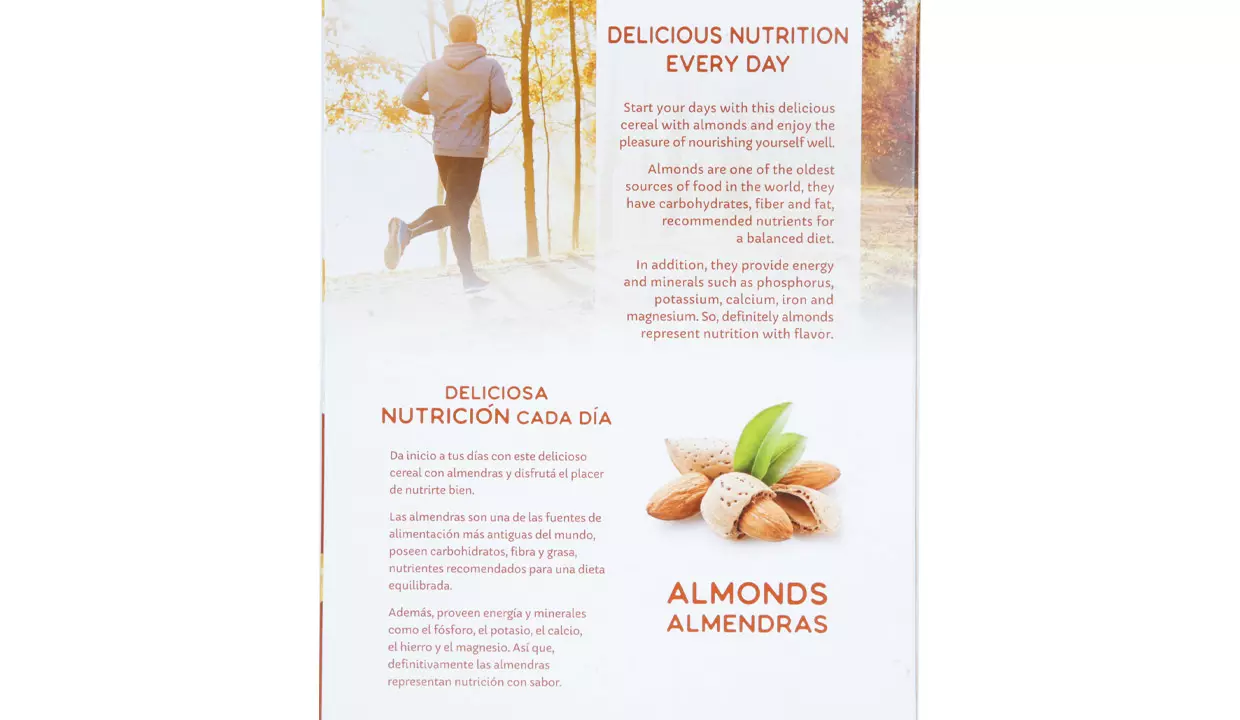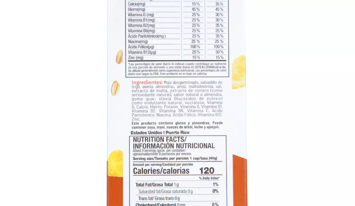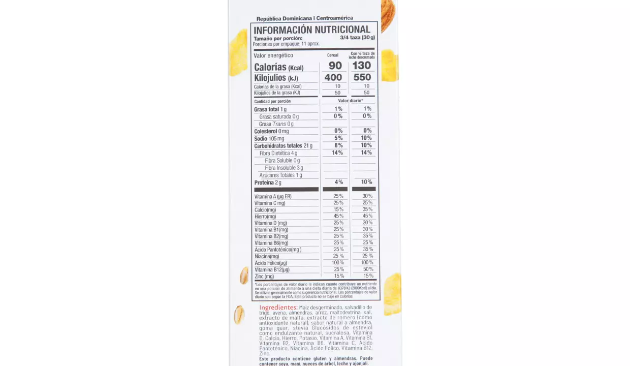 - Maíz, avena, harina de arroz, quinoa, 7% de almendras, sal, extracto de malta, sabor natural a almendras y canela.