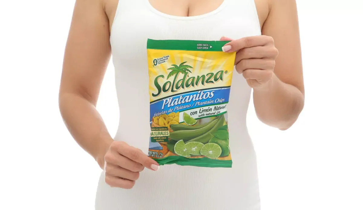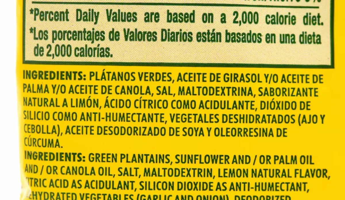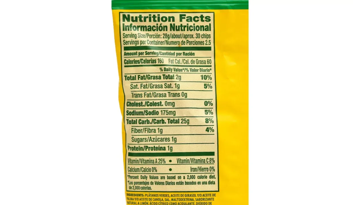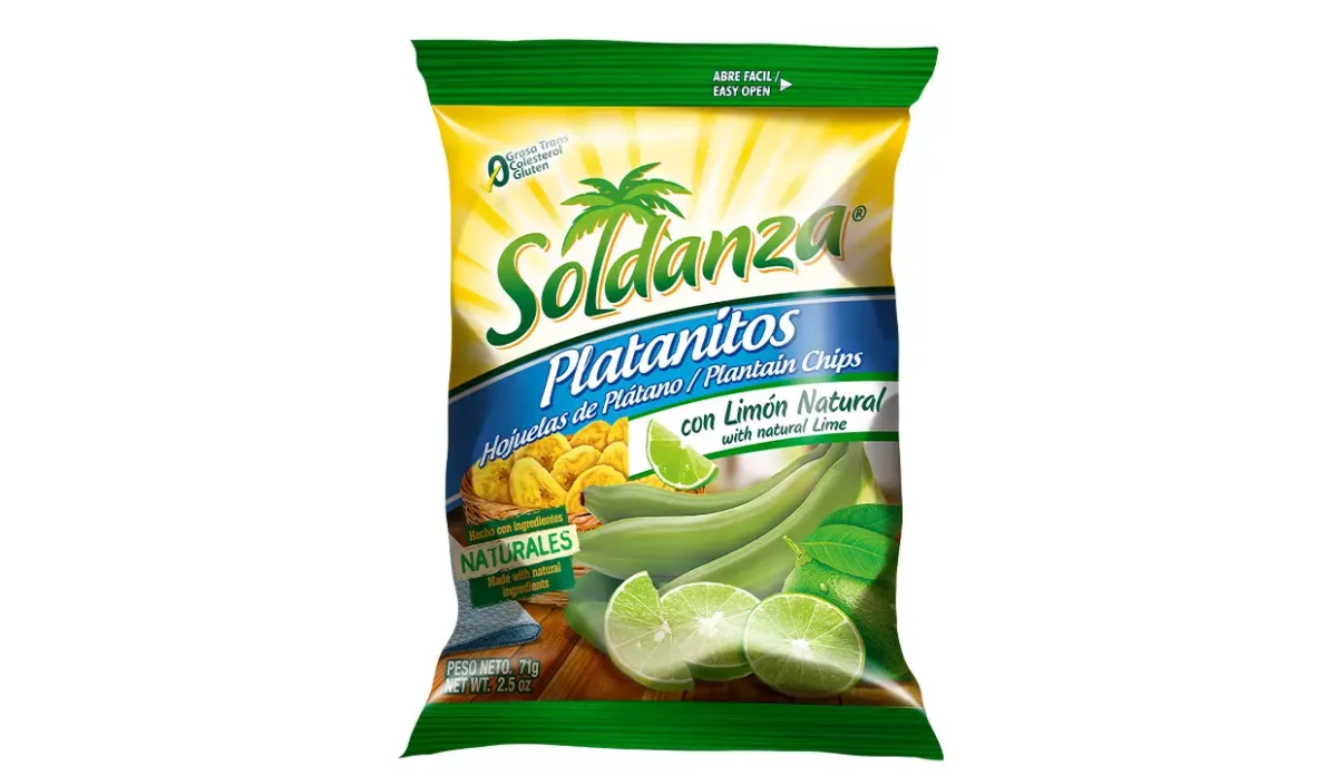 - Plátanos verdes, aceite de girasol, aceite de palma, aceite de canola, sal, saborizante natural a limón, soya y cúrcuma.