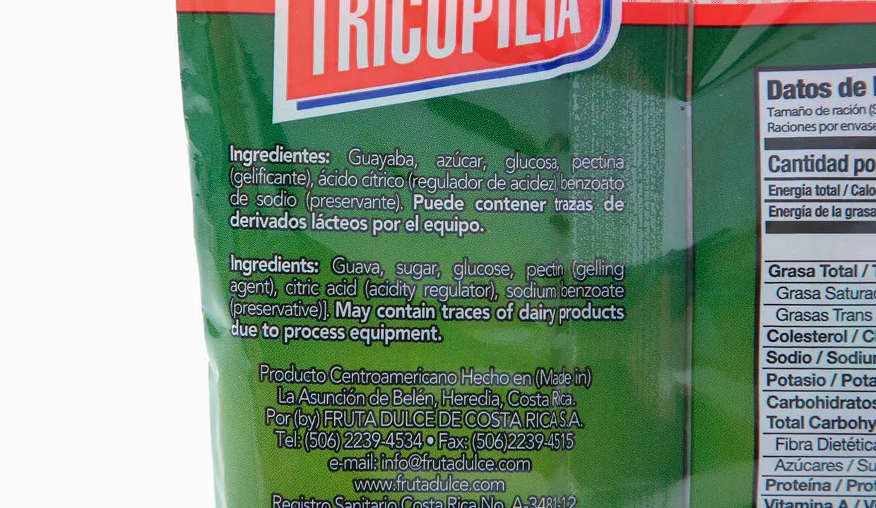 - Guayaba, azúcar, glucosa, pectina y ácido cítrico.