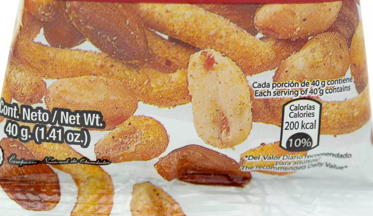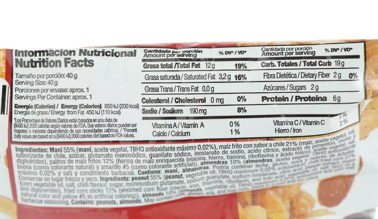 - Maní, maíz frito con sabor a chile, sal y almendras.