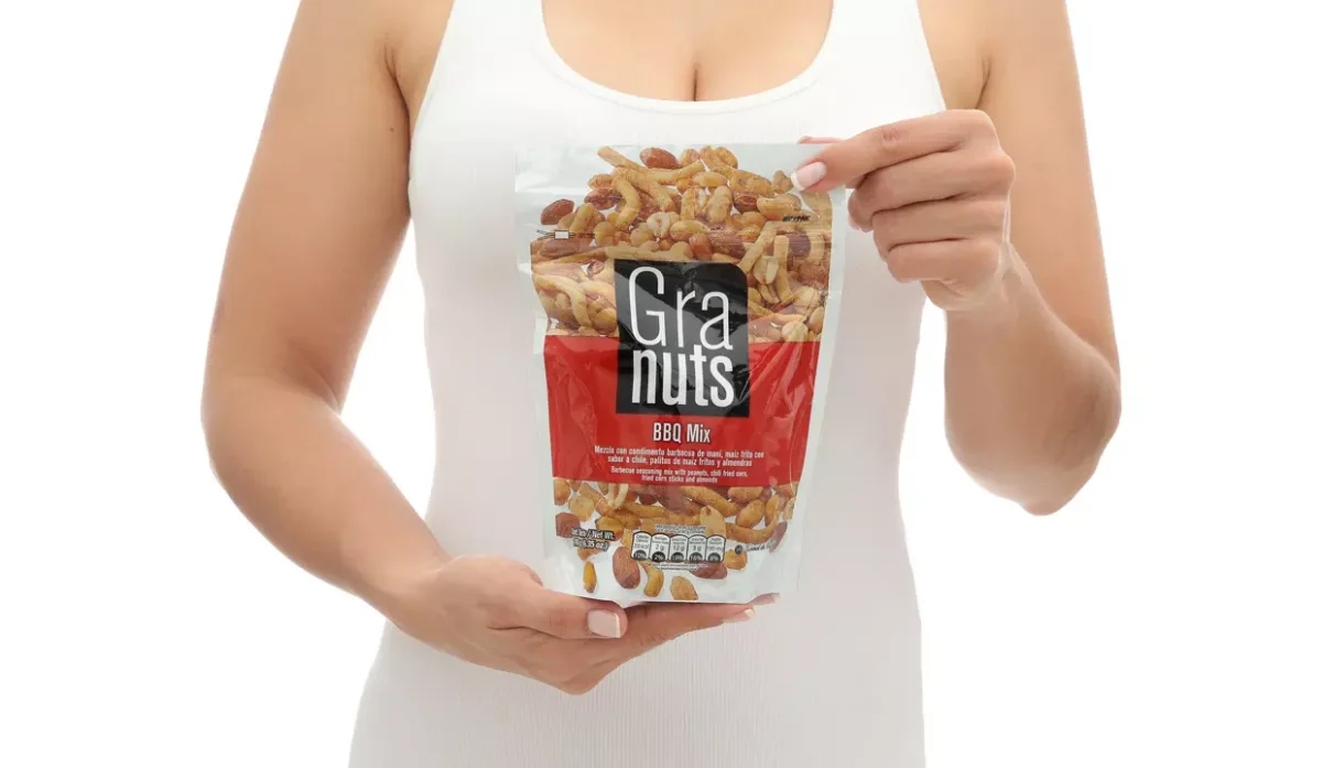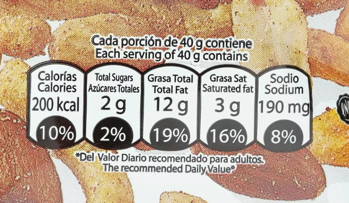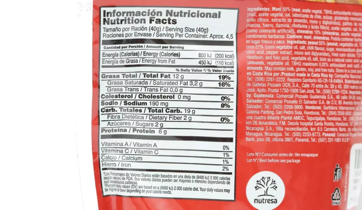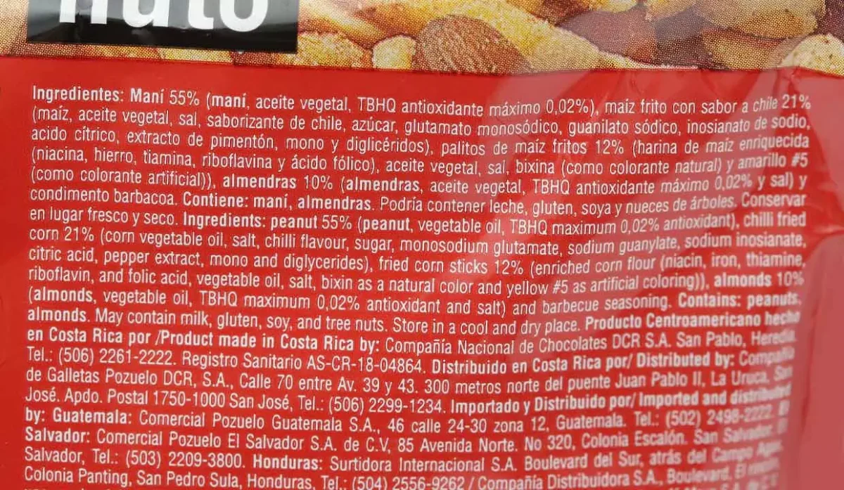 - Maní, maíz frito con sabor a chile, sal y almendras.