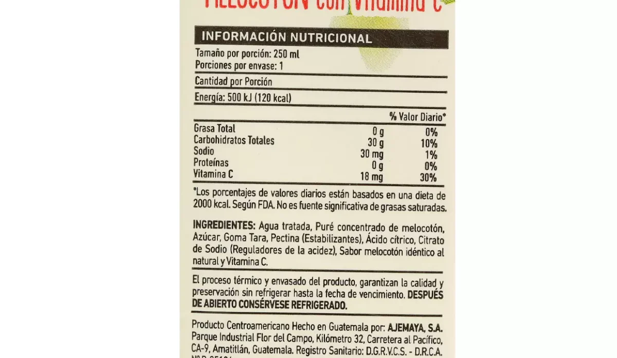 - Agua tratada, puré concetrado de melocotón, azúcar, goma tara y ácido cítrico.