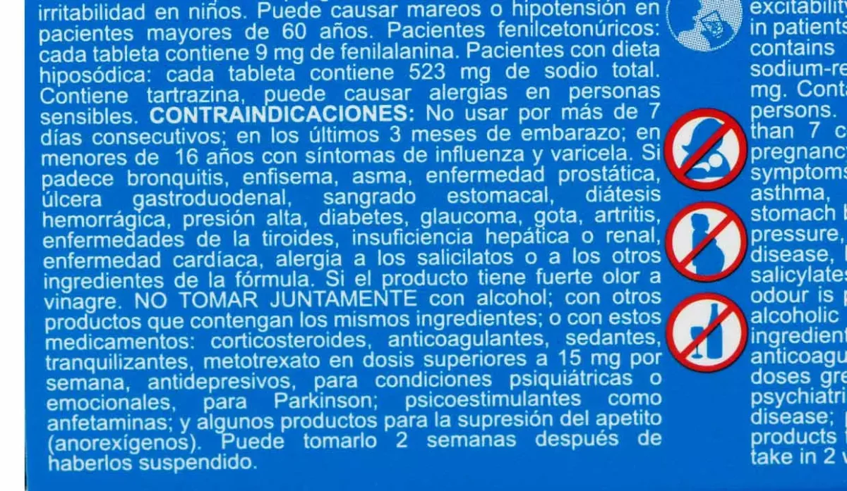 - Ácido acetilsalicílico 500mg, maleato de clorfeniramina 2mg, bitartrato de fenilefrina 8mg e ingredientes activos.