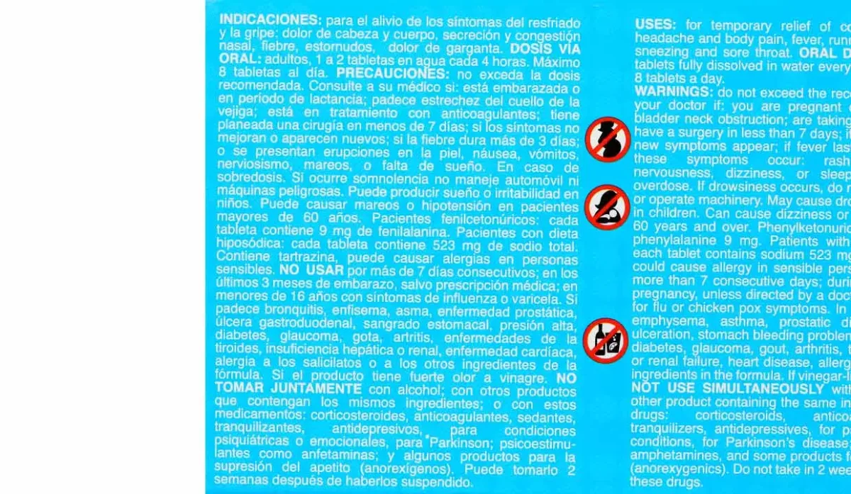 - Para alivios de síntomas del resfriado y la gripe, dolor de cabeza y cuerpo, secreción y congestión nasal, fiebre, estornudos y dolor de garganta.