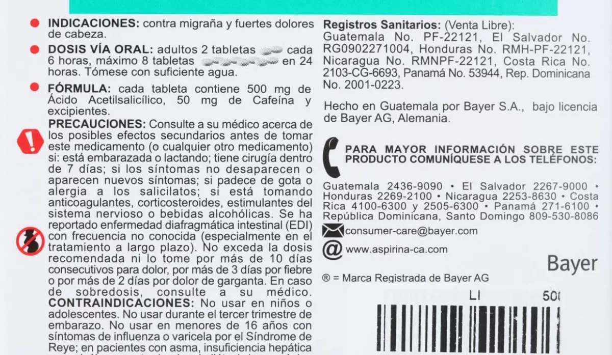 - Ácido acetilsalicílico 500mg, cafeína 50mg y excipientes.