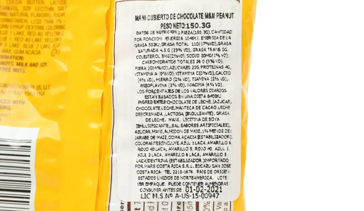 - Chocolate de leche, manteca de cacao, leche descremada, grasa de leche, maní, leche, soya, sal, azúcar, saborizantes artificiales, almidón de maíz, jarabe de maíz y colorantes.