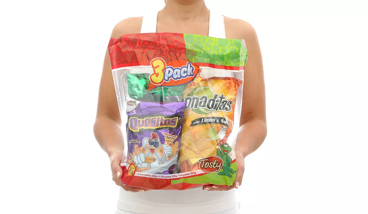 - 3 paquetes (1 paquete de quesitos, 1 paquete de tronaditas con limón y 1 paquete de chirulitos).