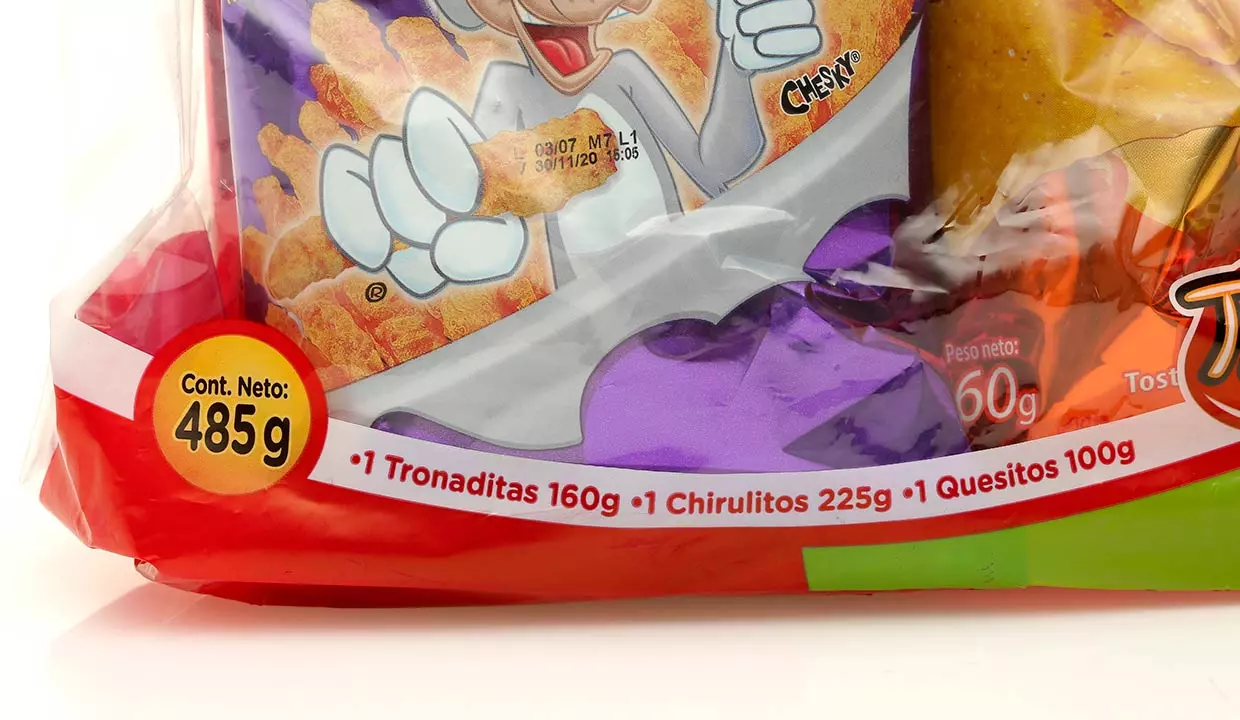 - 485g (quesitos (100g), tronaditas con limón (160g) y chirulitos (225g)).