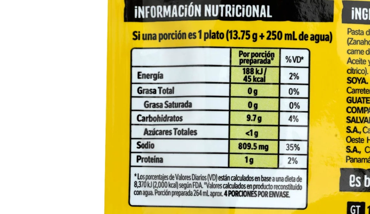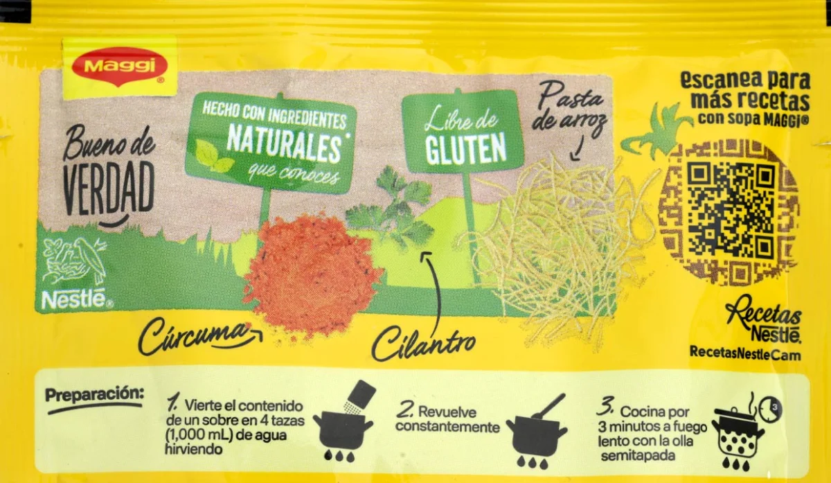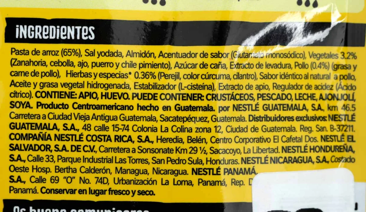 - Fideos de trigo, sal yodada, harina de trigo, azúcar, grasa de pollo, cúrcuma, ajo, hierbas, carne de pollo y apio.