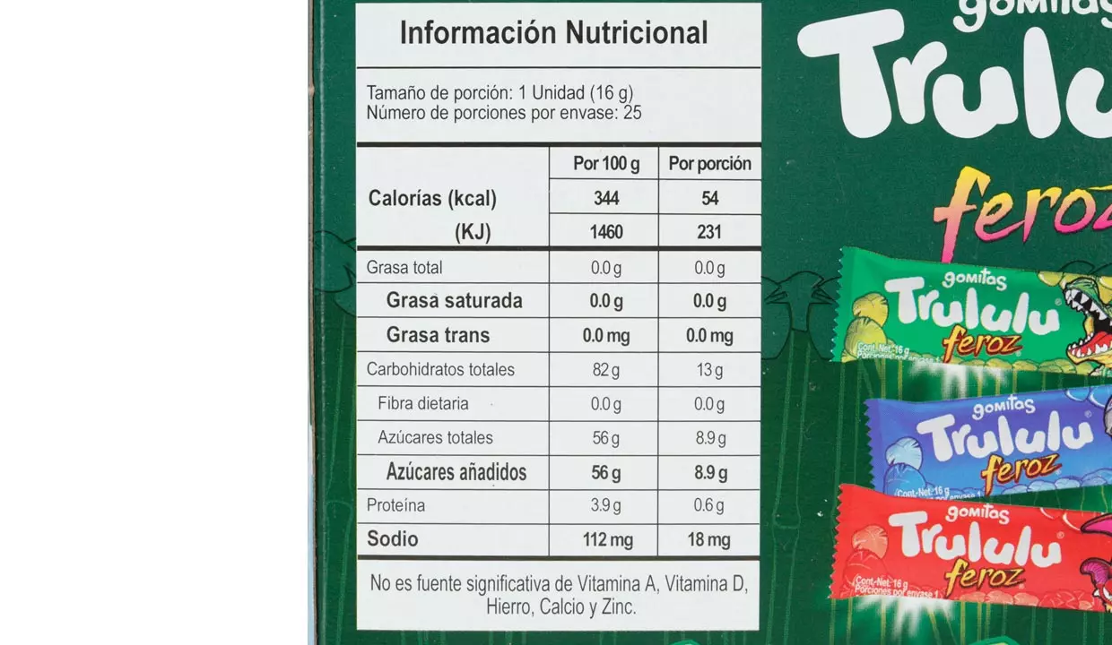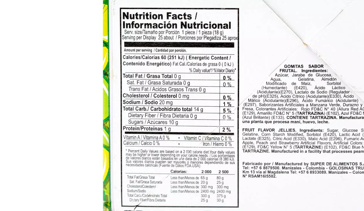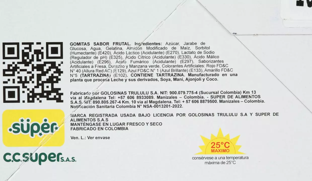 - Azúcar, jarabe de glucosa, agua, gelatina, almidón modificado de maíz, humectante (sorbitol), acidulantes (ácido láctico, ácido citrico), saborizantes artificiales, agentes de recubrimiento (cera de abejas, cera de carnauba), colorantes artificiales, tartranzina. (Puede contener: maní huevo y leche)..