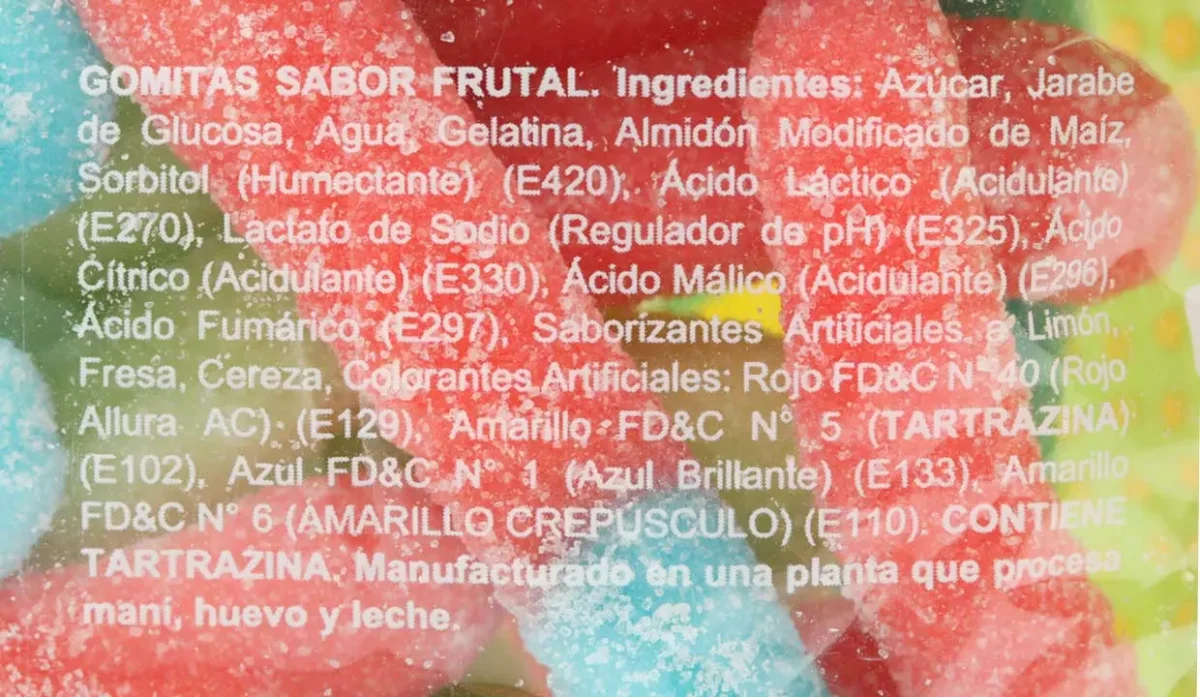 - Jarabe de glucosa, azúcar, agua, gelatina, tartrazina, almidón, ácido láctico, sabor artificial a fresa, limón y cereza.
