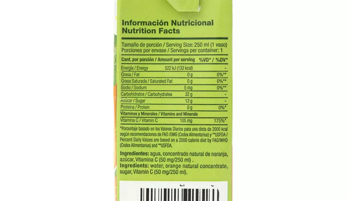 - Agua, concentrado natural de naranja, azúcar y vitamina C.