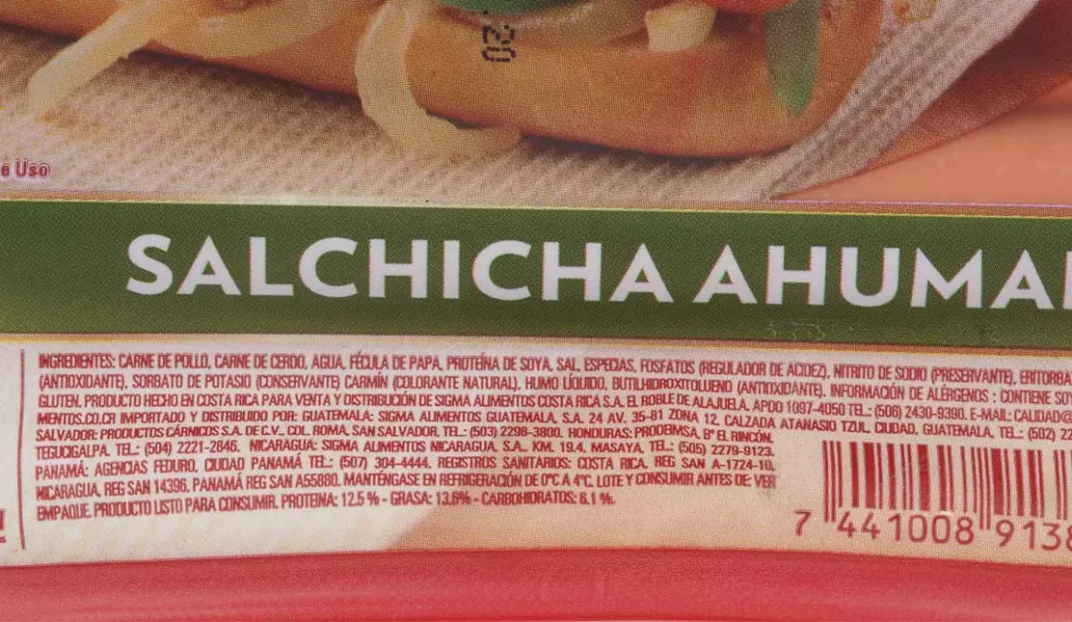 - Carne de pollo y cerdo, agua, fécula de papa, soya, sal y especias.
