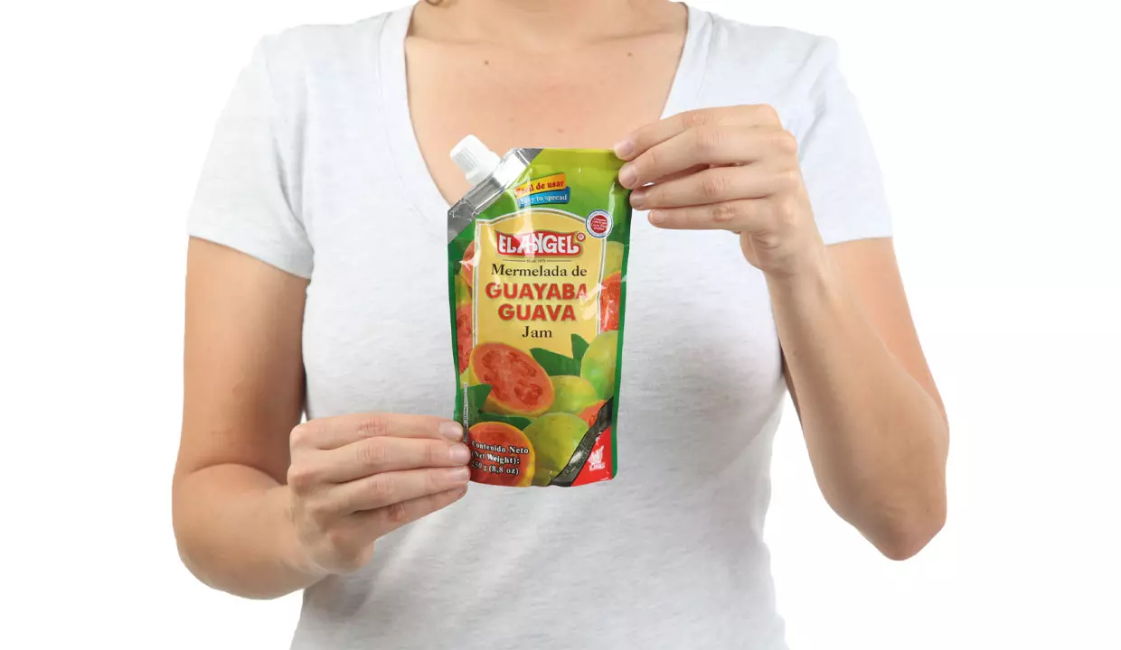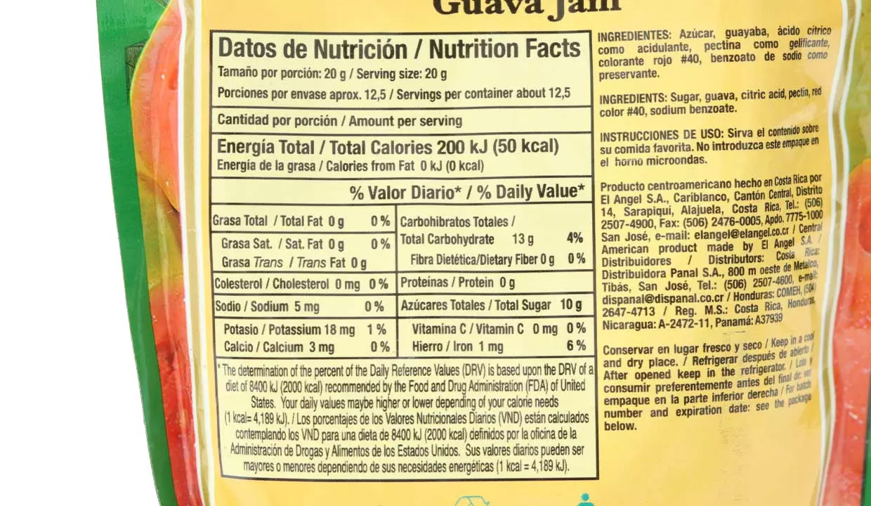 - Azúcar, guayaba, ácido cítrico, pectina, colorante rojo #40 y benzoato de sodio.