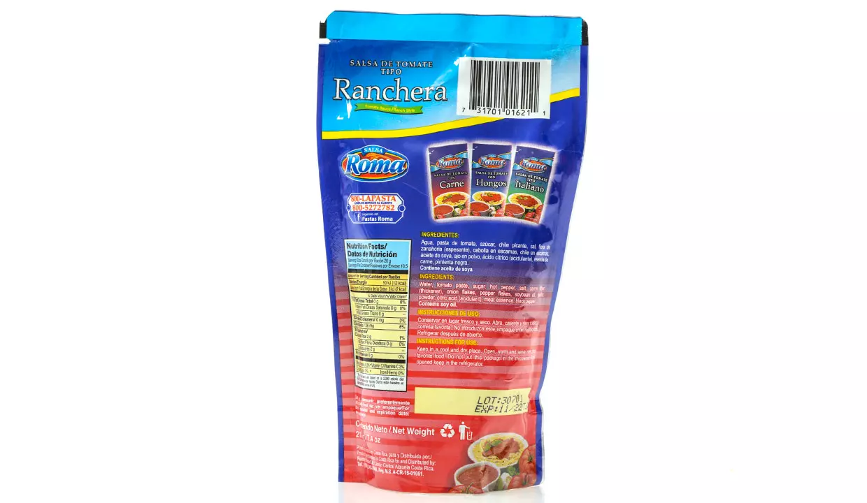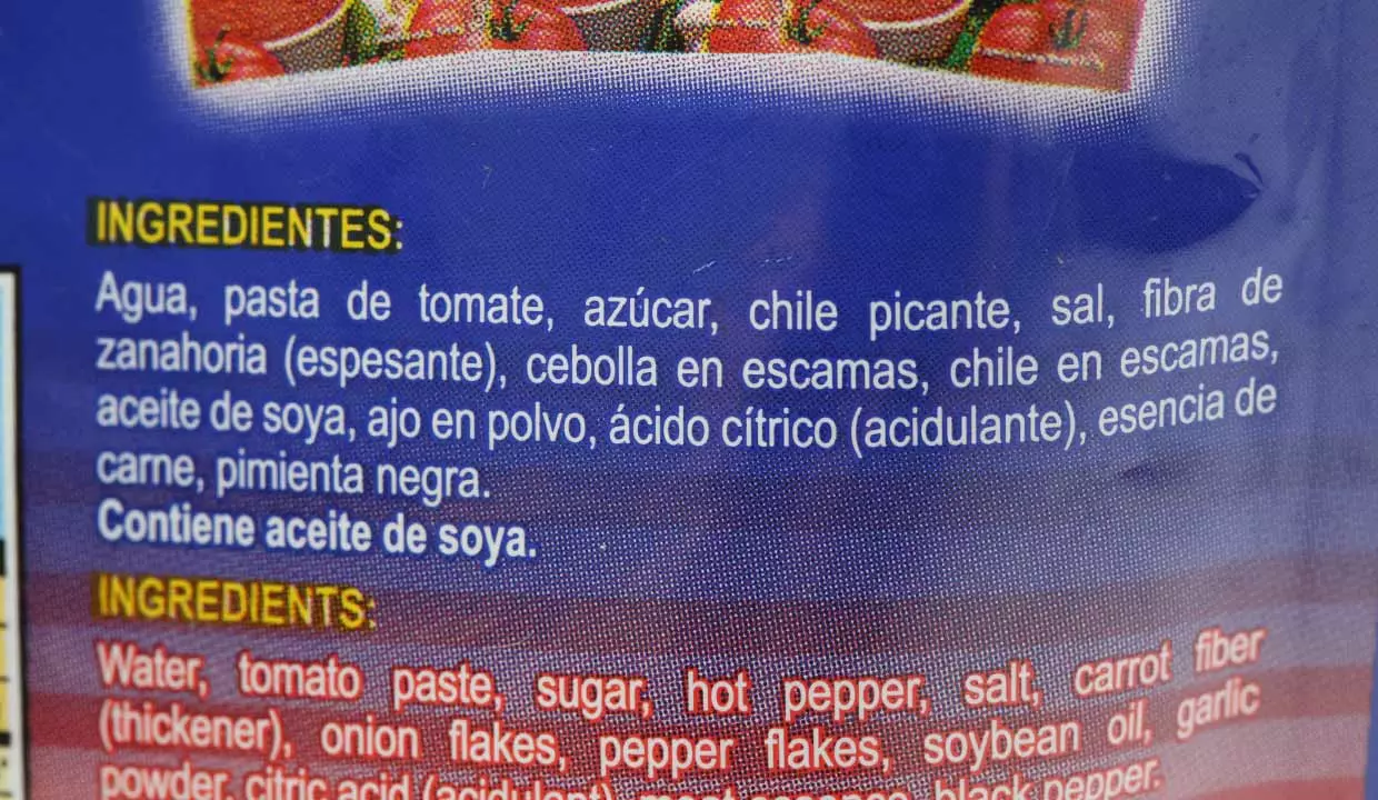 - Agua, pasta de tomate, azúcar, chile picante, sal, fibra de zanahoria, cebolla, chile dulce, aceite de soya, ajo en polvo, ácido cítrico, esencia de carne y pimienta negra.