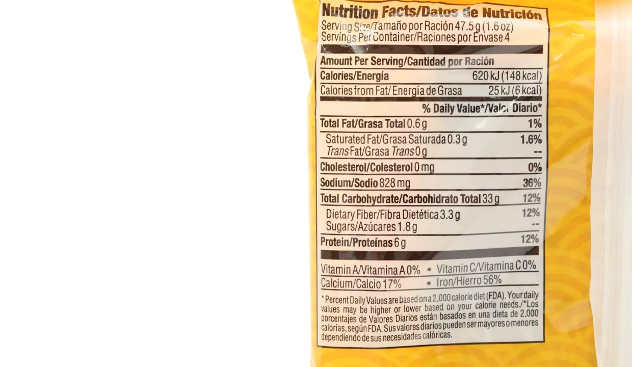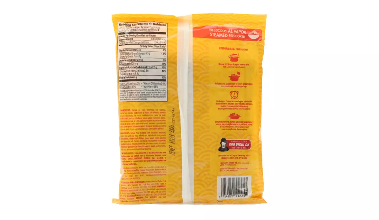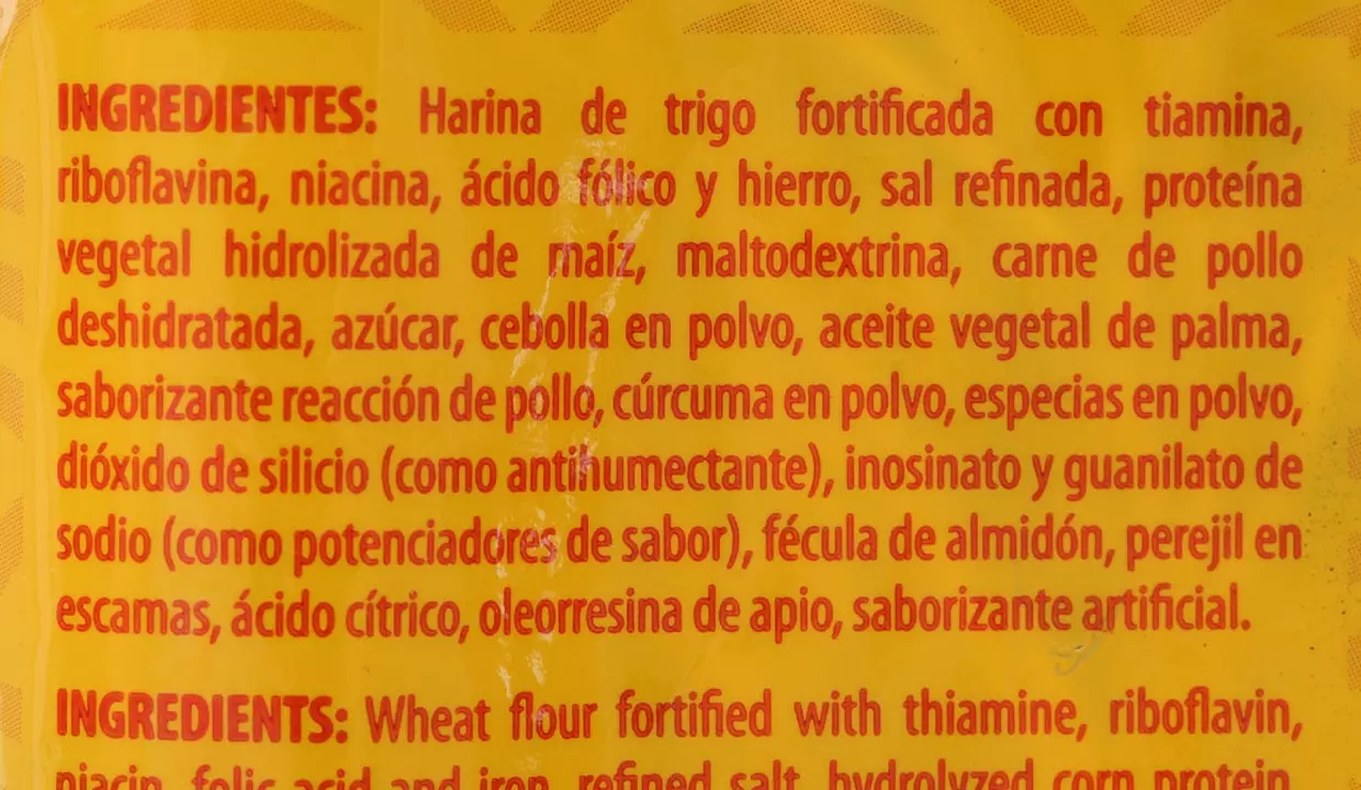 - Harina de trigo fortificada, sal refinada, proteína vegetal, azúcar, cebolla en polvo, aceite vegetal de palma, saborizantes de pollo, ajo y especias en polvo.