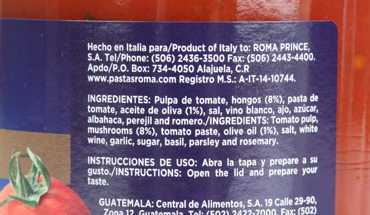 - Pulpa de tomate, pasta de tomate, hongos, vino blanco, aceite de oliva, sal, ajo, azúcar, albahaca, perejil y romero.
