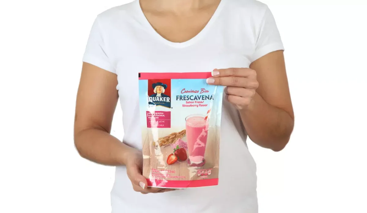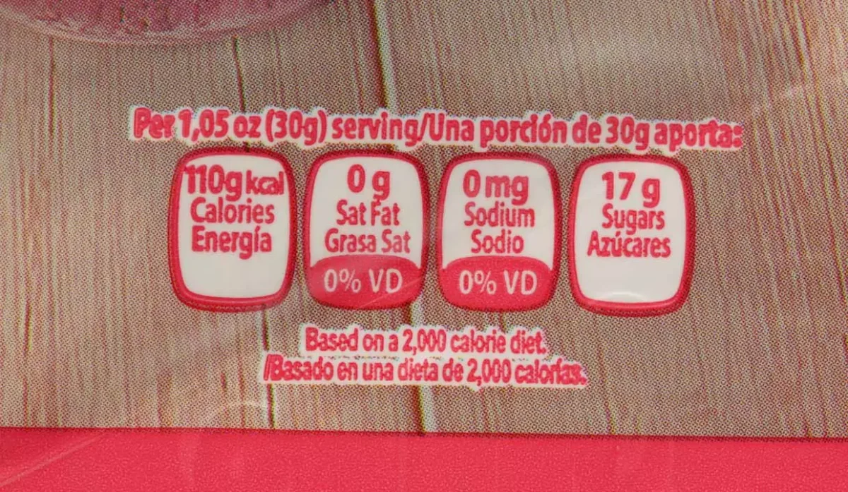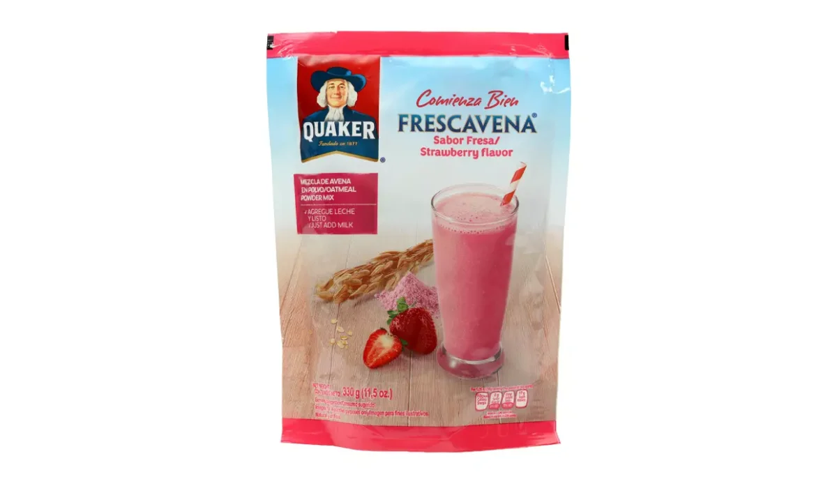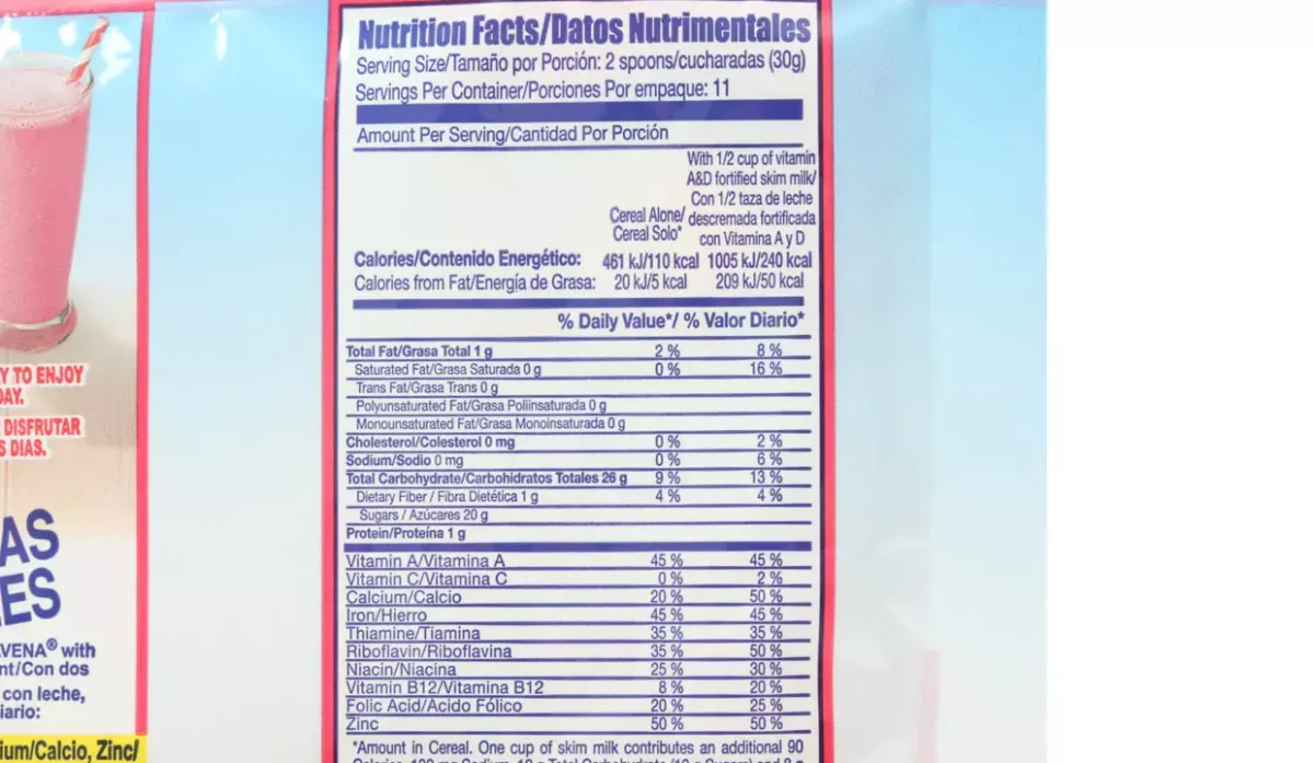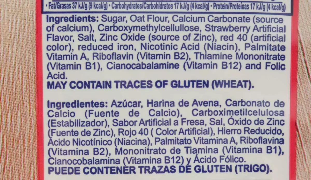 - Azúcar, harina de avena, calcio, sabor artificial a fresa, zinc, vitaminas, hierro y ácido fólico.