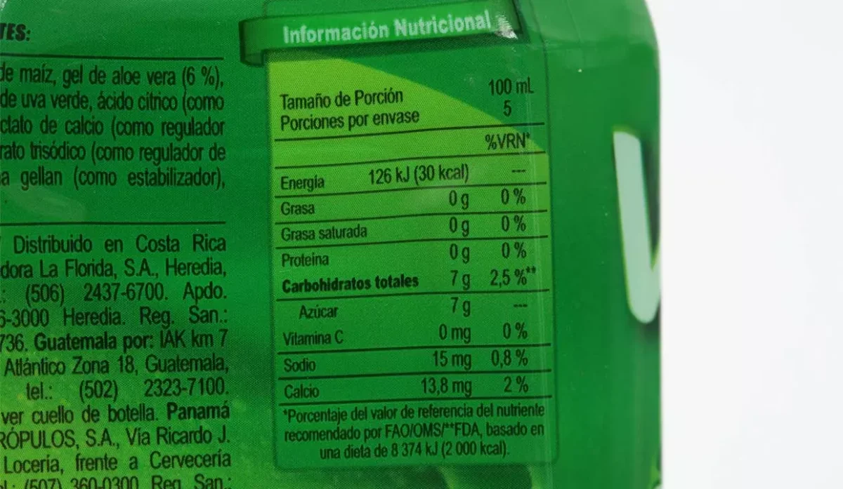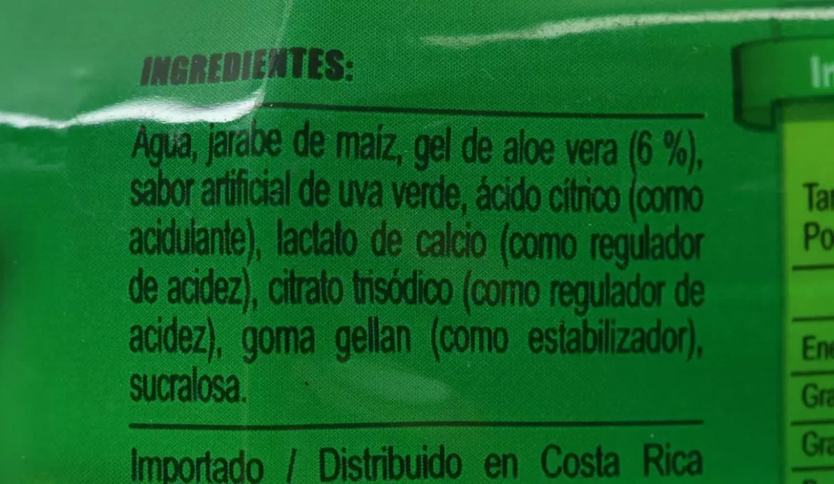 - Agua, jarabe de maíz, gel de aloe vera, sabor artificial a uva verde y goma gellan.