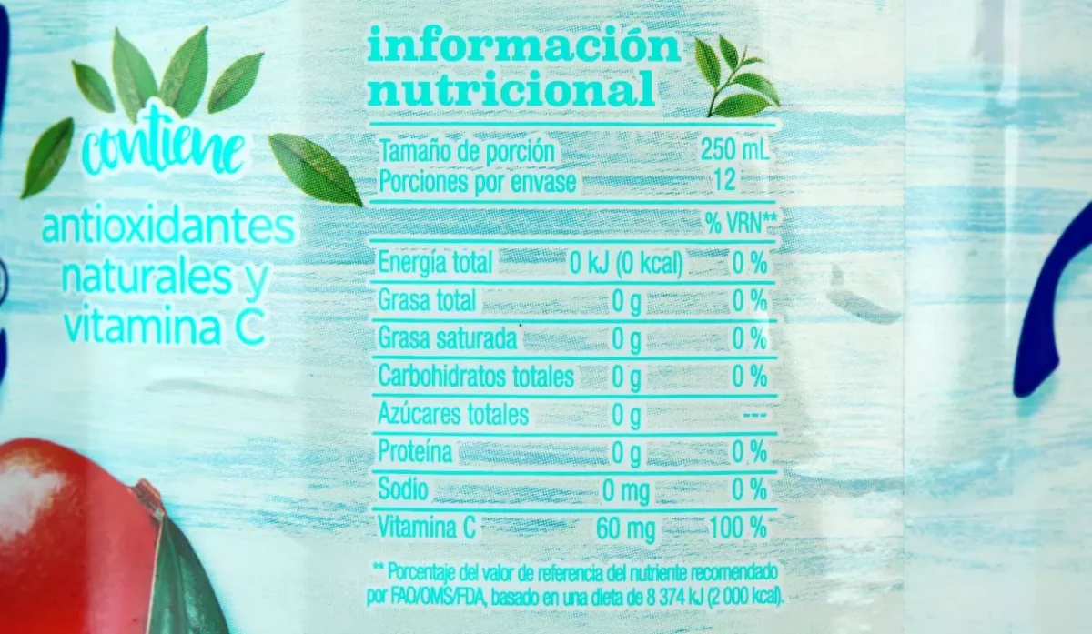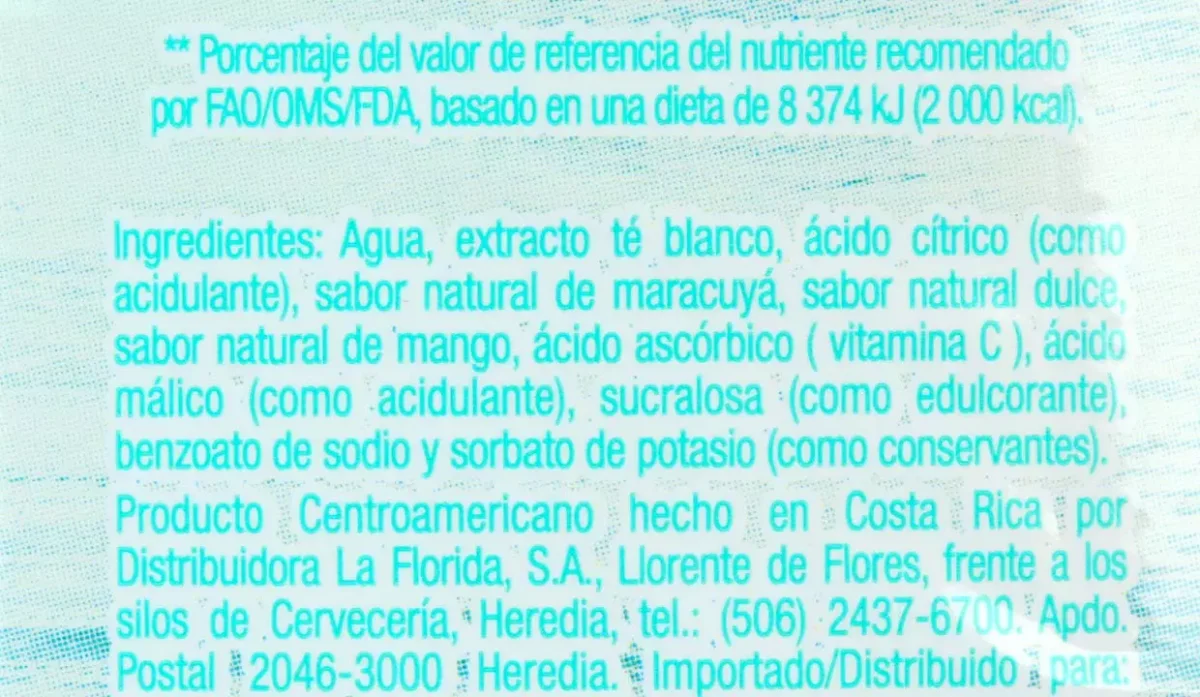 - Agua, té blanco, ácido cítrico, sabor natural a maracuyá y mango.