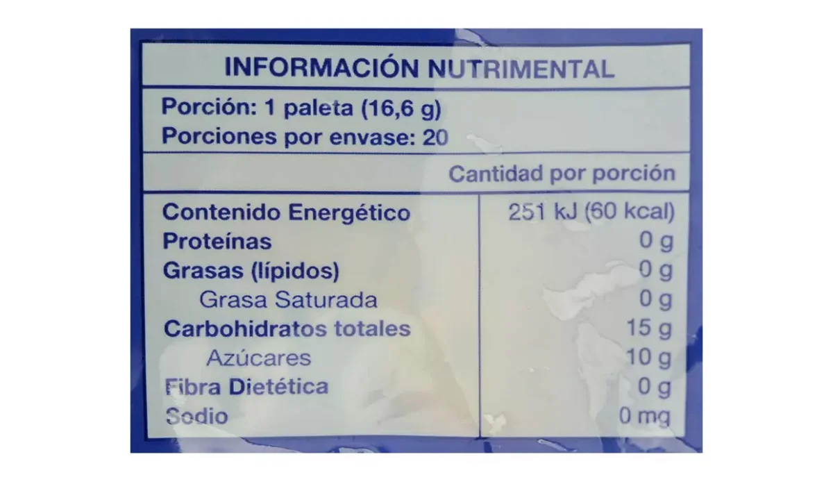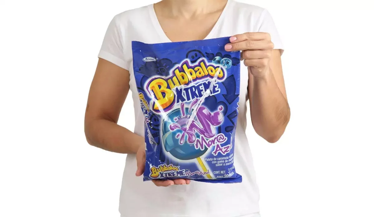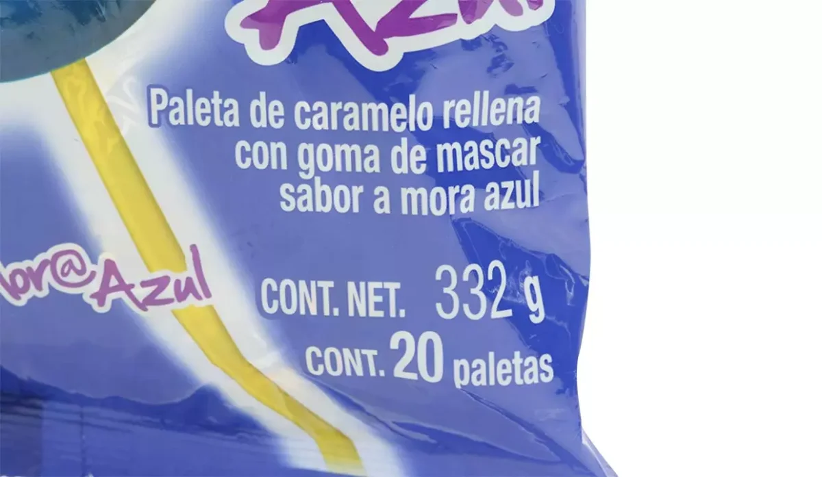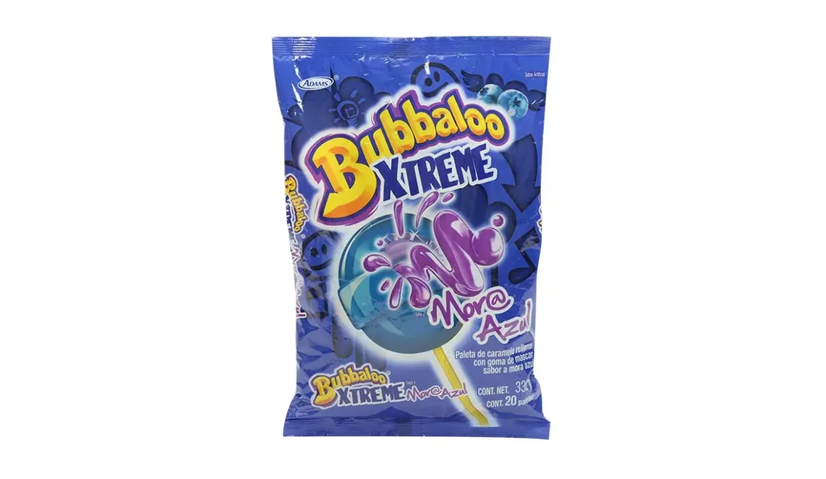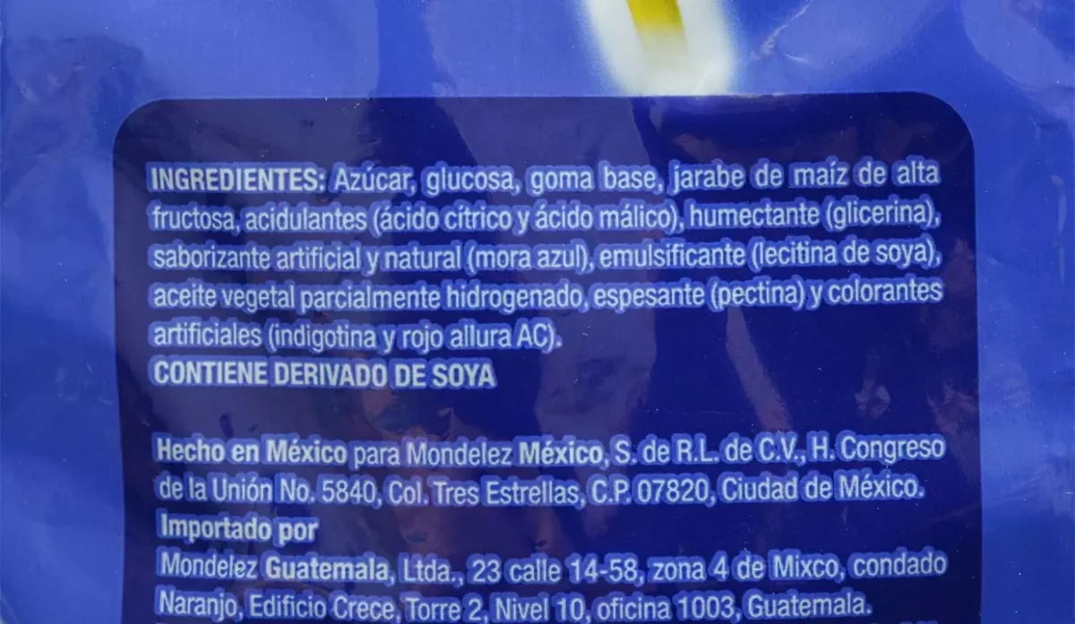 - Azúcar, glucosa, goma base, jarabe de maíz, acidulantes, saborizante natural y artificial a mora azul, aceite vegetal y colorantes.