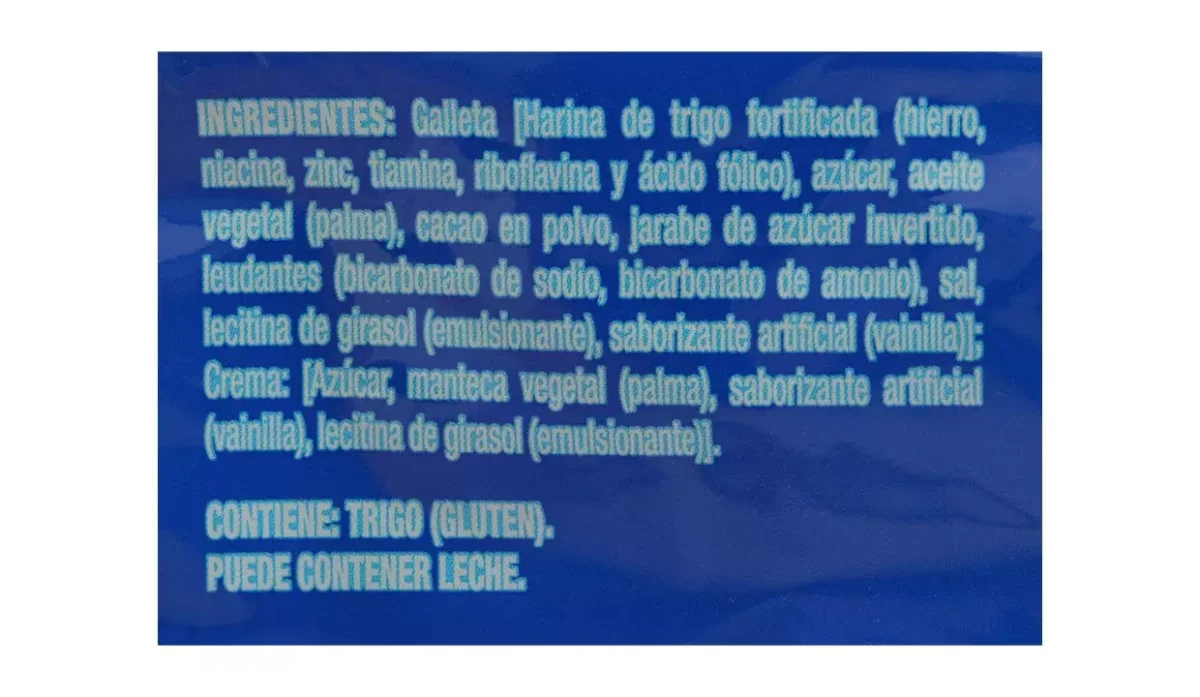 - Harina de trigo fortificada, azúcar, aceite vegetal, grasa animal, cacao en polvo, jarabe de maíz, sal, lecitina de soya y saborizante artificial a vainilla.