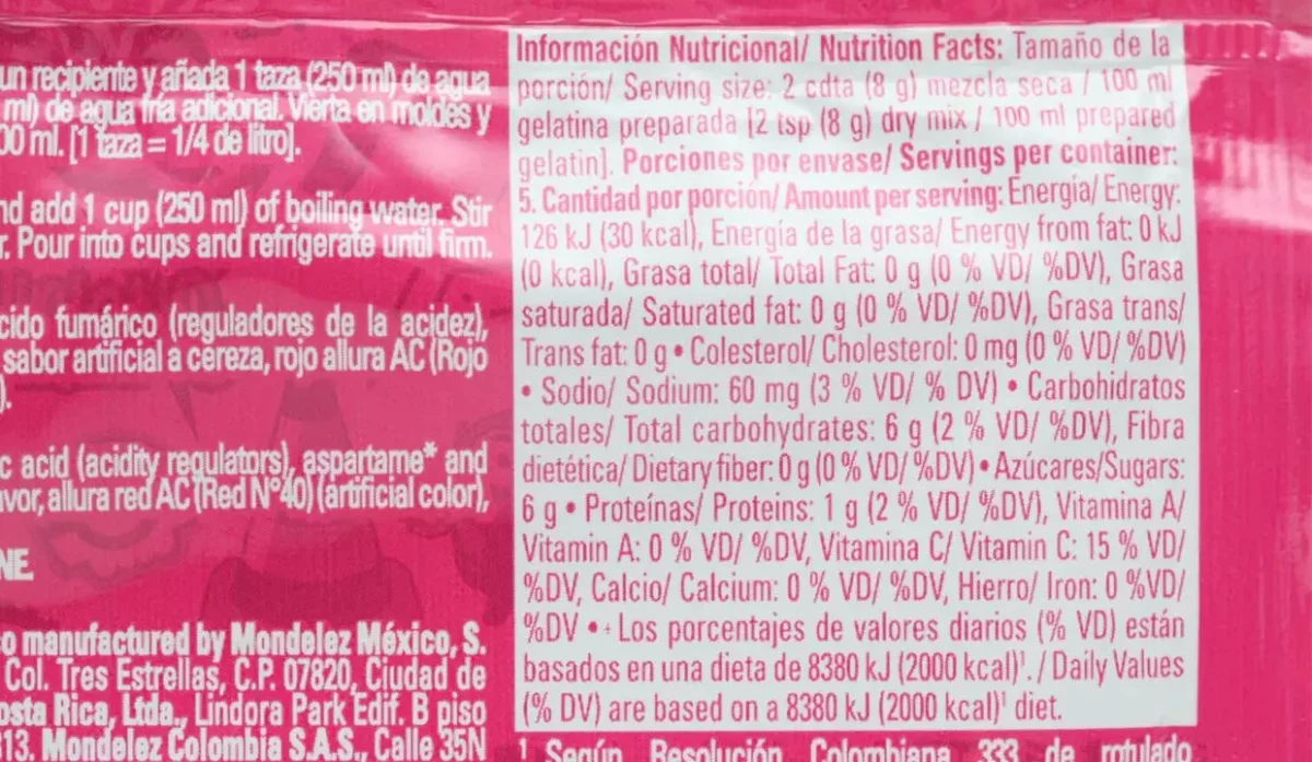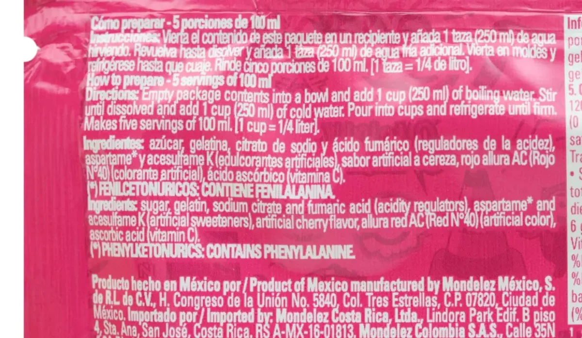 - Azúcar, gelatina, citrato de sodio, ácido fumárico, aspartame, colorantes artificiales, tartrazina y sabor artificial a cereza.