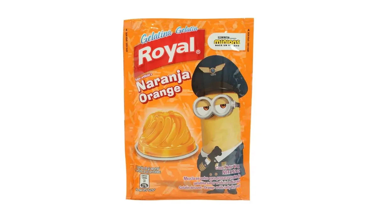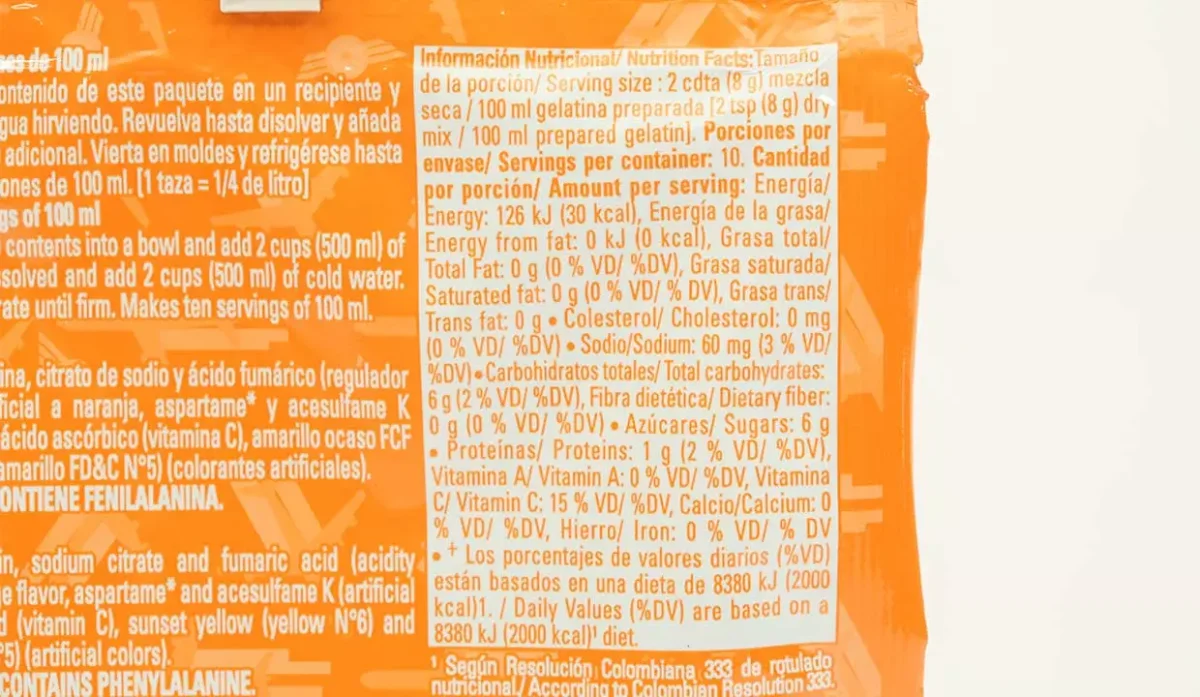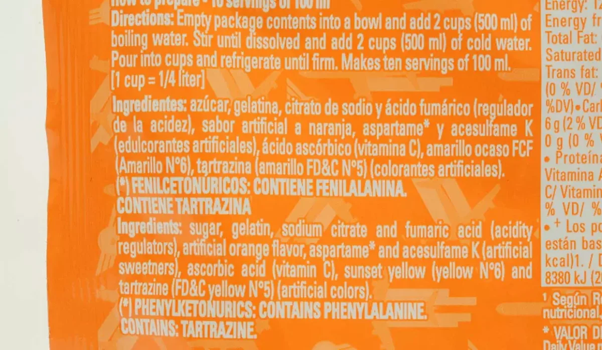 - Azúcar, gelatina, citrato de sodio, ácido fumárico, aspartame, colorantes artificiales, tartrazina y sabor artificial a naranja.