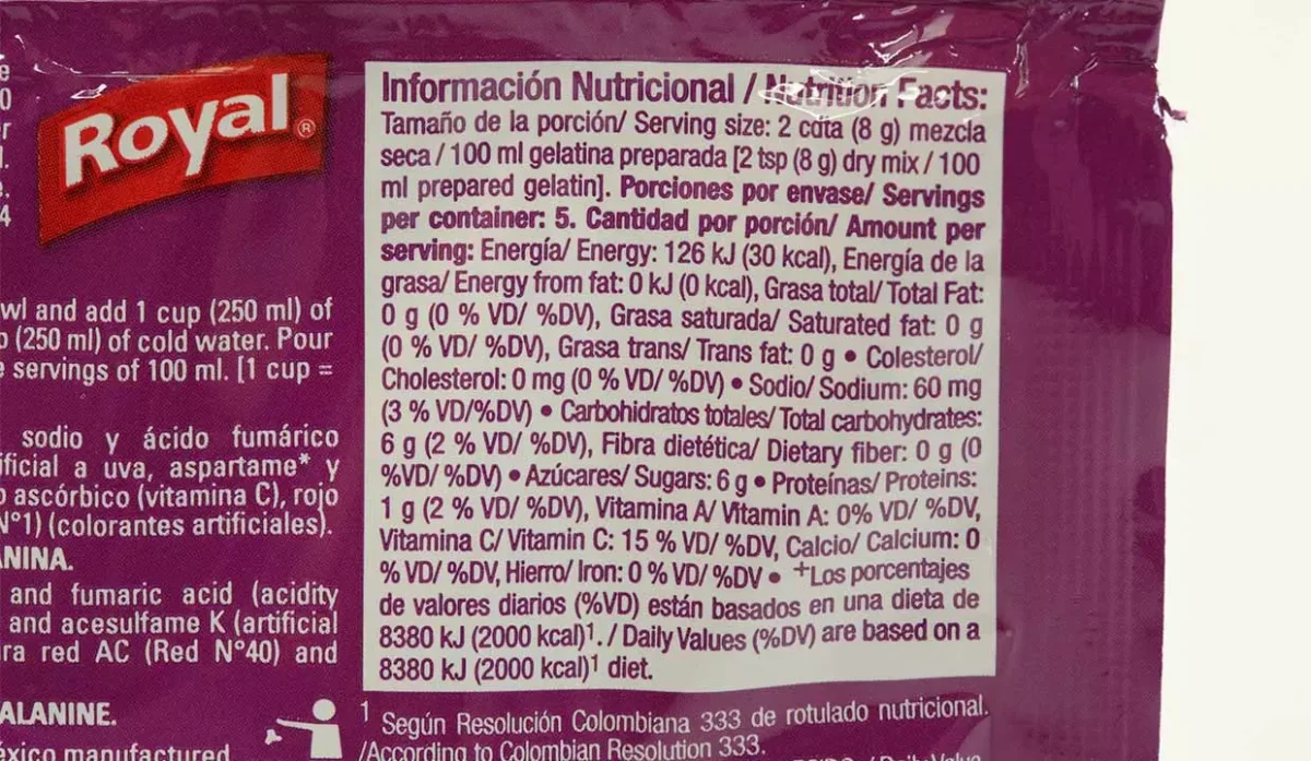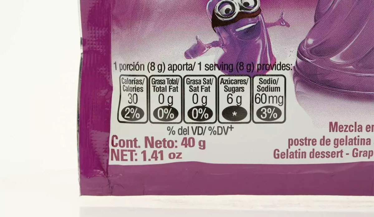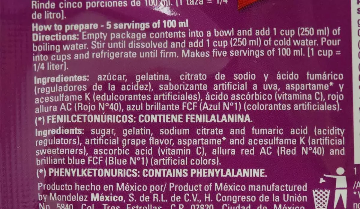- Azúcar, gelatina, citrato de sodio, ácido fumárico, aspartame, colorantes artificiales, tartrazina y sabor artificial a uva.