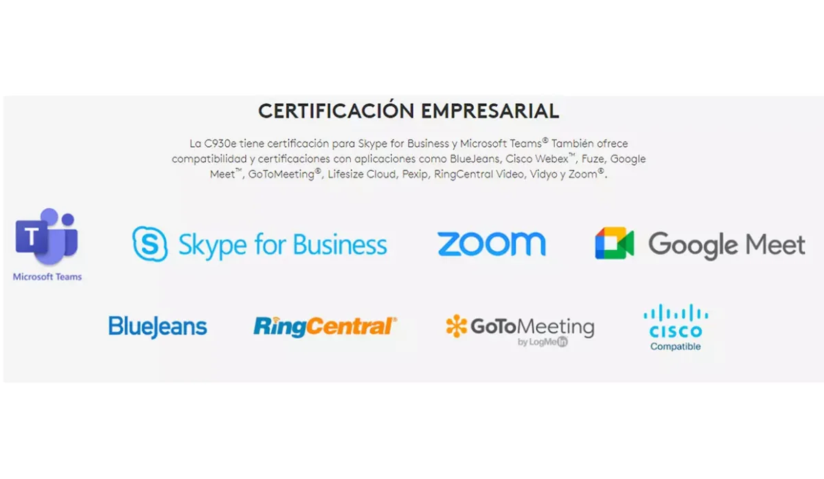 - Compatibilidad y certificaciones con aplicaciones como: BlueJeans / Cisco Webex / Fuze / Google Meet / GoToMeeting / Lifesize Cloud / Pexip / Ring Central Video / Vidyo / Zoom.