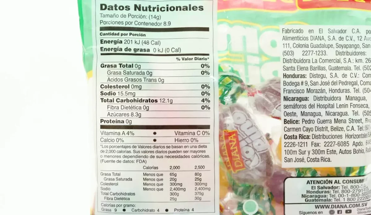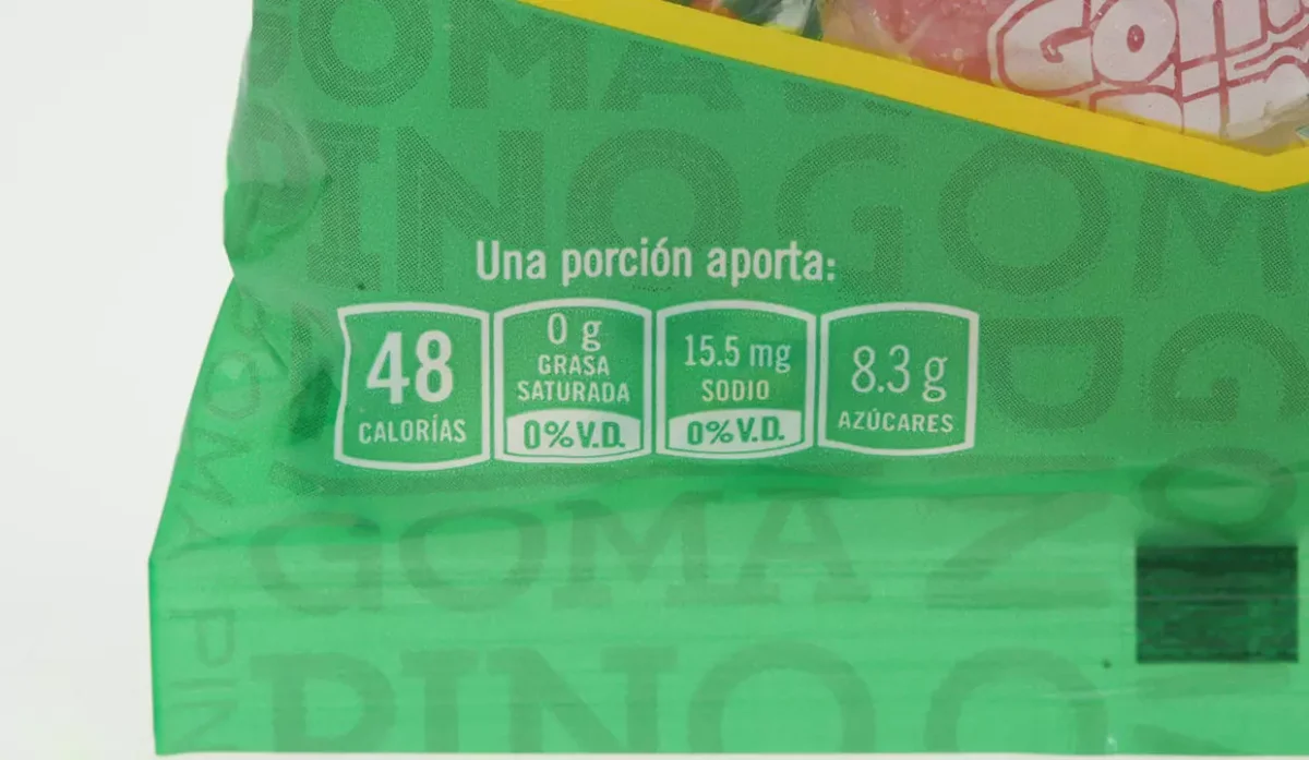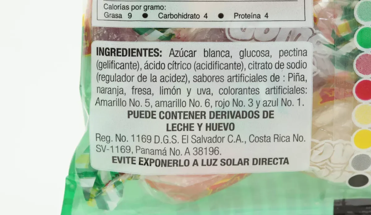 - Azúcar blanca, glucosa, pectina (gelificante), ácido cítrico, sabores artificiales de: piña, naranja, fresa, limón y uva.