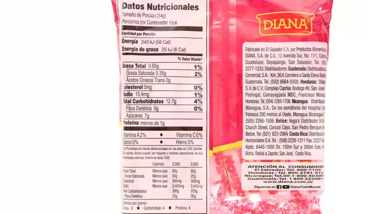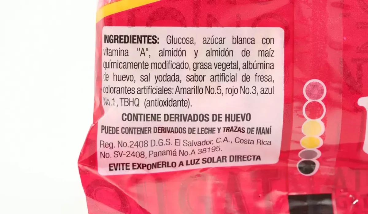 - Glucosa, azúcar blanca con vitamina A, almidón y almidón de maíz, grasa vegetal, albúmina de huevo, sal yodada, sabor artificial de fresa.