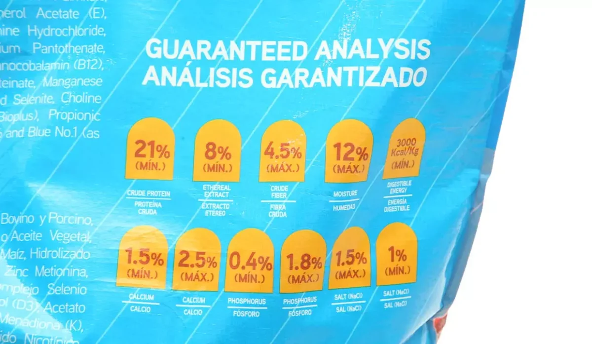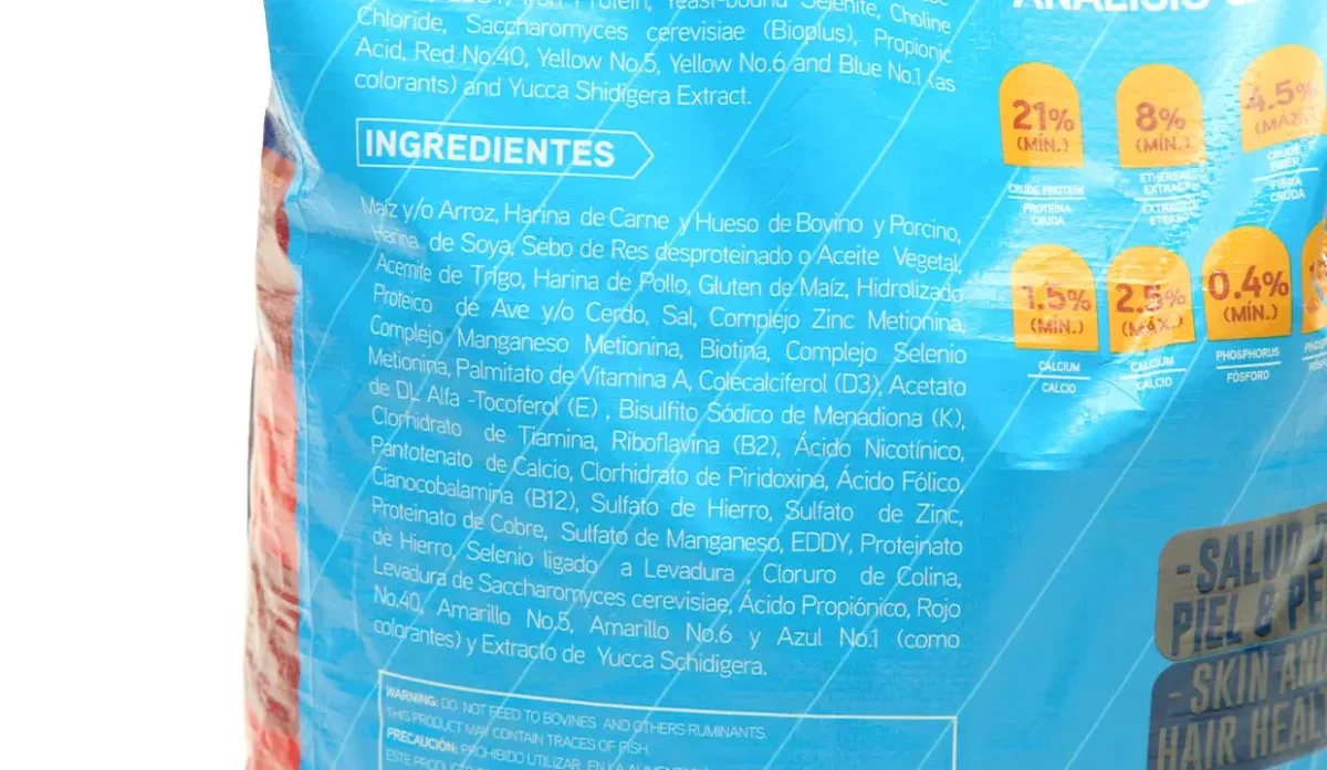 - Maíz y/o arroz, harina de carne, hueso de bovino y porcino, harina de soya, sebo de bovino desproteinado o aceite vegetal, harina de pollo, gluten de maíz, hidrolizado proteico de ave y/o cerdo y sal.