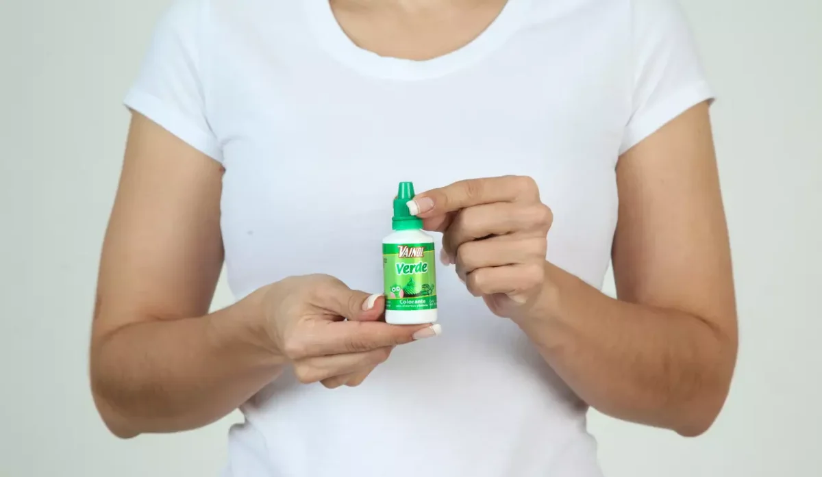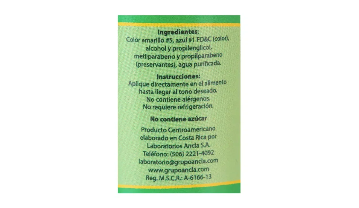 - Color amarillo #5, azul #1, alcohol, propilenglicol, metilparabeno, propilparabeno y agua.