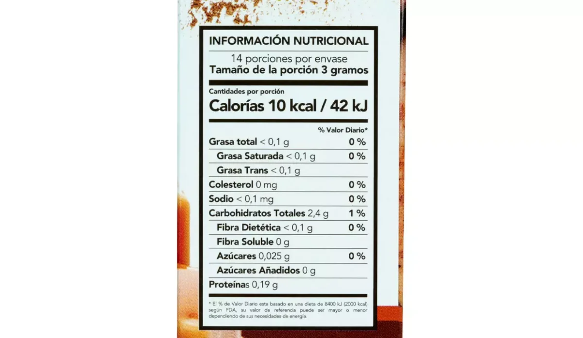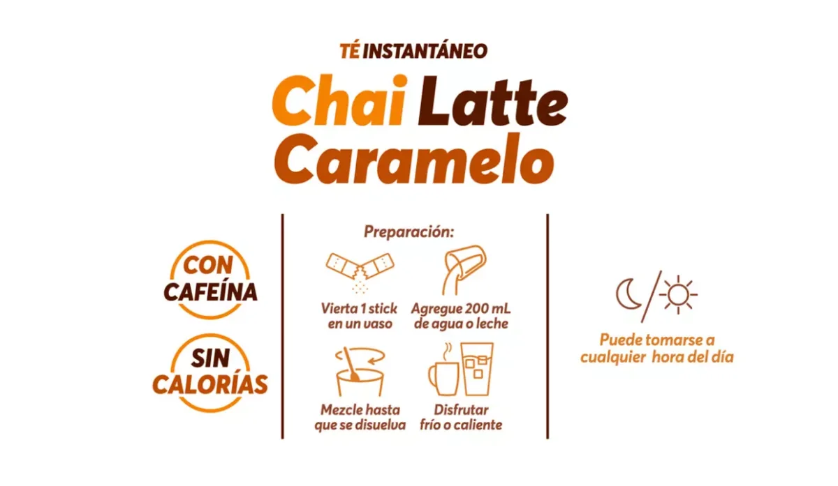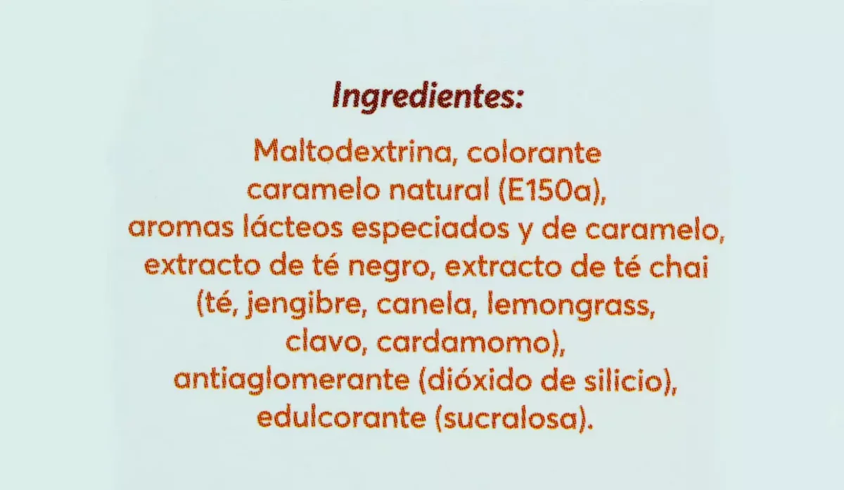 - Maltodextrina, caramelo natural, aromas lácteos especiados y de caramelo, extracto de té negro, extracto de té chai (té, jengibre, canela, lemongrass, clavo y cardamomo), antiaglomerante y edulcorante.