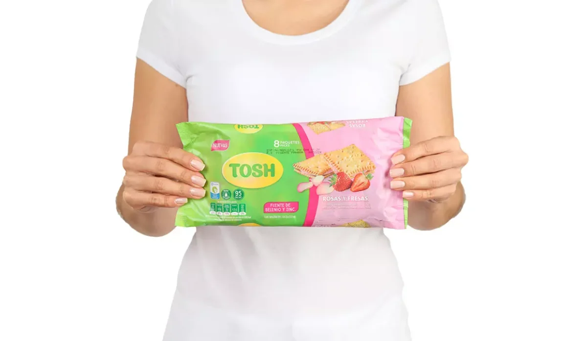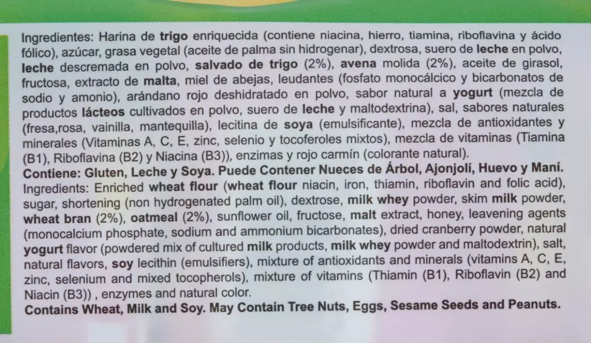 - Harina de trigo, azúcar, grasa vegetal, suero de leche en polvo, leche descremada en polvo, avena molida, fresa, rosa y vainilla.