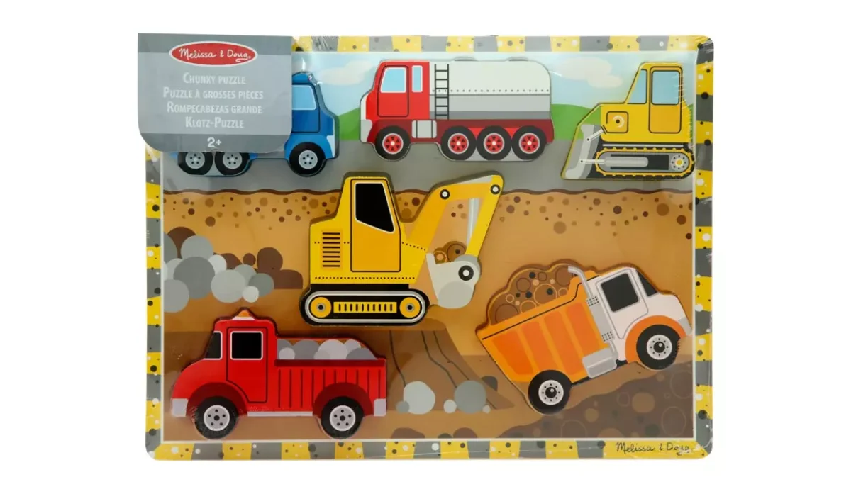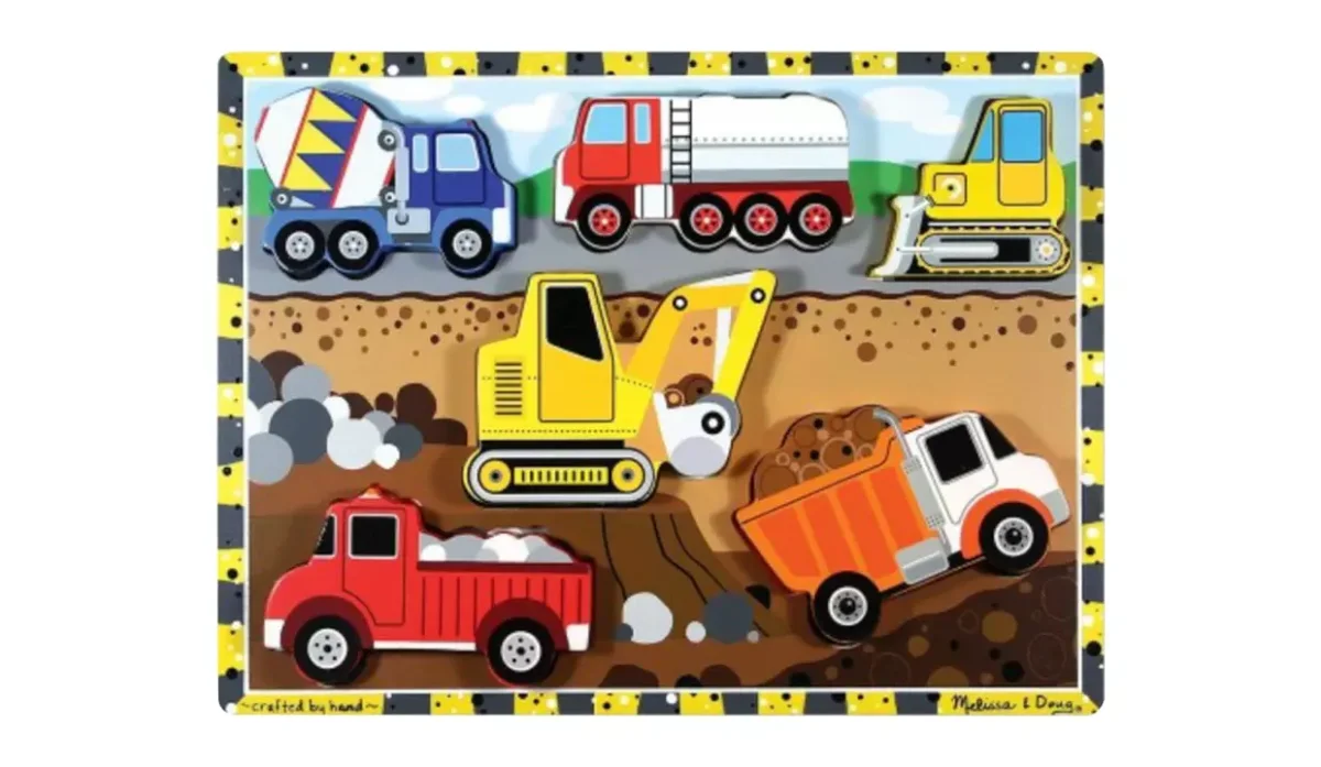 - Rompecabezas de madera con 6 piezas de vehículos y 1 base.