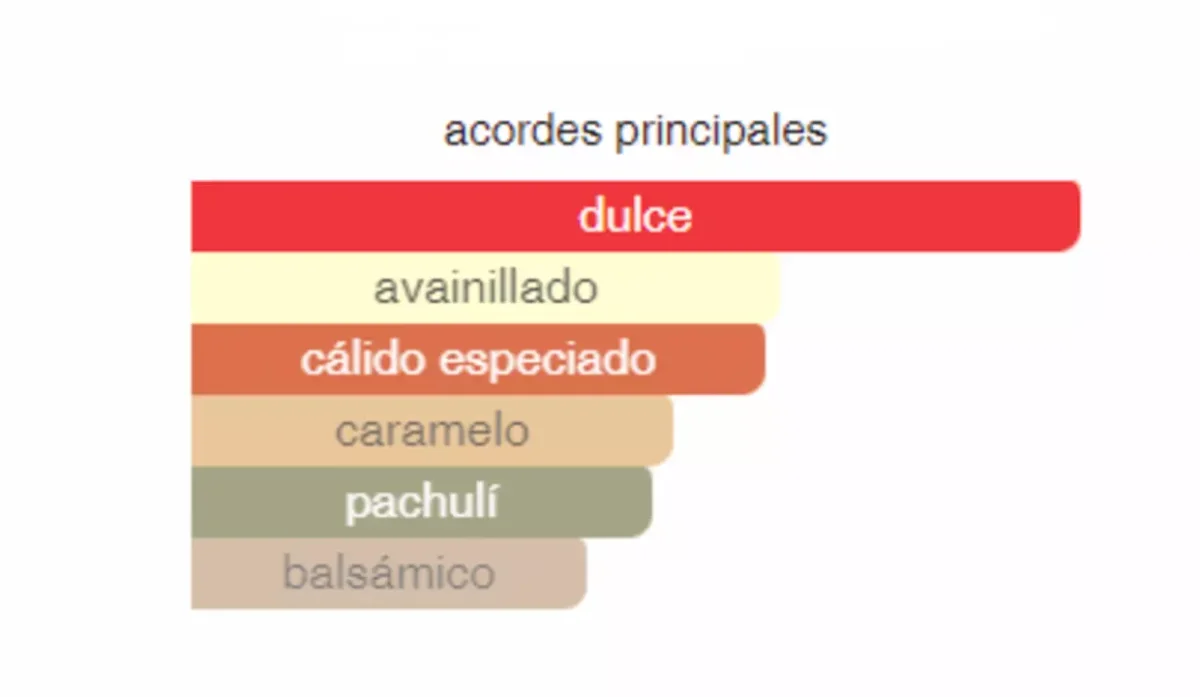 - Notas de fondo: sándalo, vainilla, resinas y ámbar.