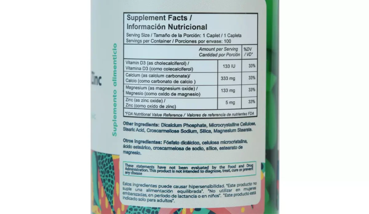 - Vitamina D, calcio, magnesio, zinc, fósfato dicálcico, celulosa microcristalina, ácido esteárico,croscamelosa de sodio, sílice y estearato de magnesio.